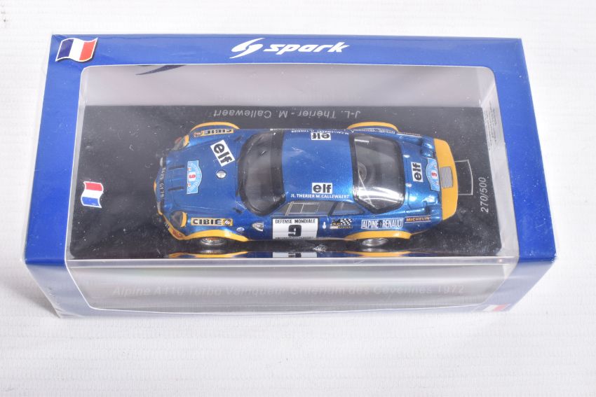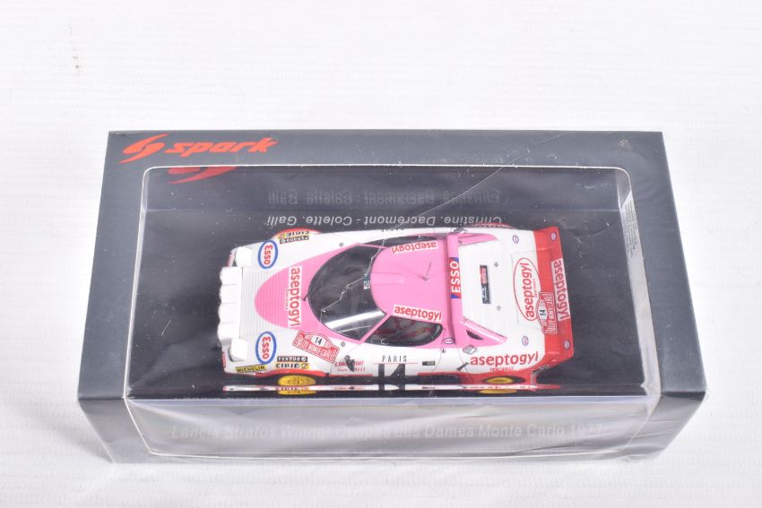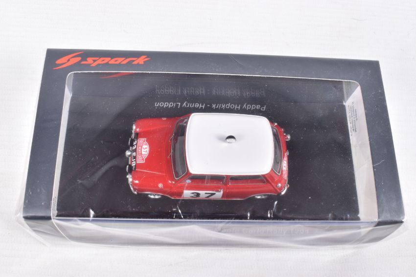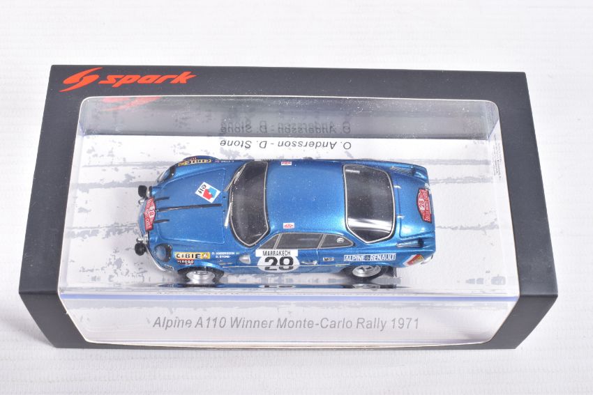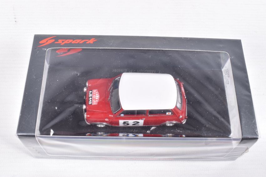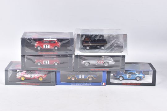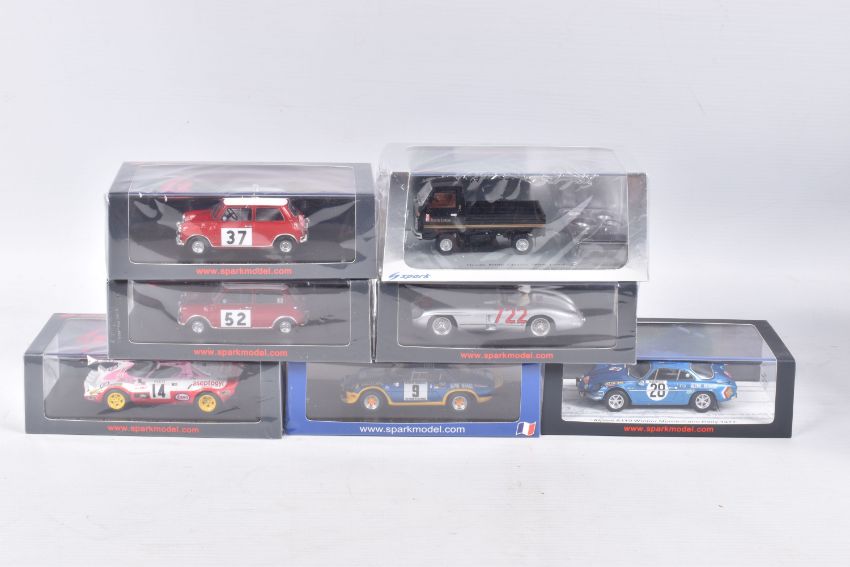 SEVEN BOXED SPARK MODEL MINIMAX VEHICLES, to include a Honda TN360 Classic Team Lotus, numbered S2677, in plastic wrapping, a Lancia Stratos Winner Coupes des Dames Monte Carlo 1977, Christine Dacremont -Colette Galli, numbered S9101, in plastic wrapping, an Alpine A110 Turbo Vainqueur Criterium des Cevennes 1972, J-L Therier - M Callewaert, in plastic wrapping, an Alpine A110 Winner Monte Carlo Rally 1971, O. Anderson - D. Stone, numbered S6104, a BMC Cooper S Winner Rally Monte Carlo 1965, T. Makinen - P Easter, numbered S 1193, in plastic wrapping, a Morris Cooper S Winner Monte Carlo Rally 1964, Paddy Hopkirk - Henry Liddon, numbered S4890, in plastic wrapping, and a Mercedes-Benz 300 SLR Winner Mille Miglla 1955, Stirling Moss - Denis Jenkinson, numbered S5859, in plastic wrapping, all in new condition