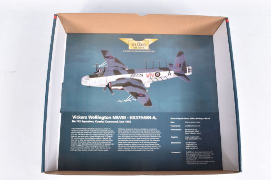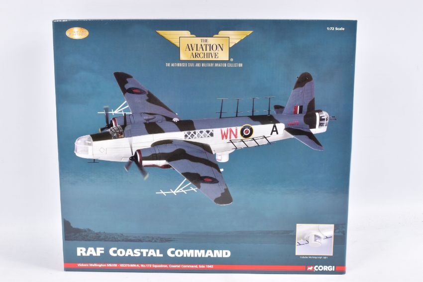A BOXED LIMITED EDITION CORGI AVIATION ARCHIVE RAF COASTAL COMMAND VICKERS WELLINGTON MK VIII 1:72 SCALE DIECAST MODEL AIRCRAFT, numbered AA34805, appears in new condition inside polystyrene packing and outer cardboard box, all antennas still attached, certificate bagged and numbered 0632 of 1940, includes spare part and instructions