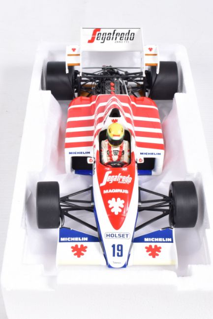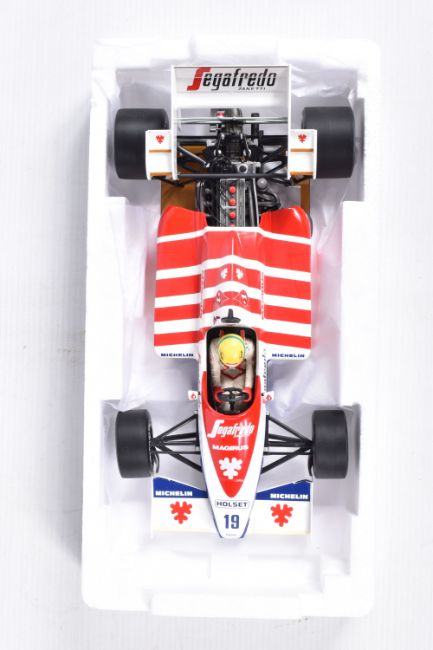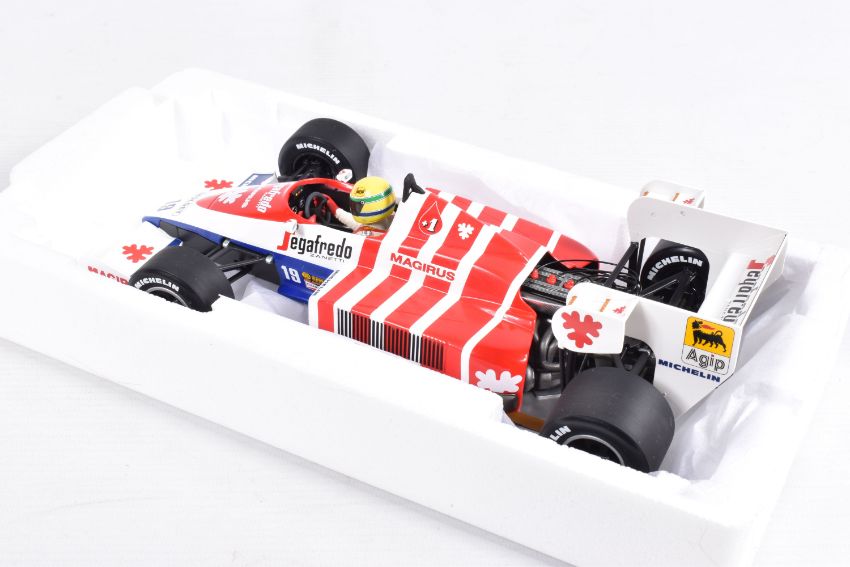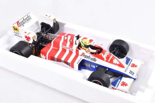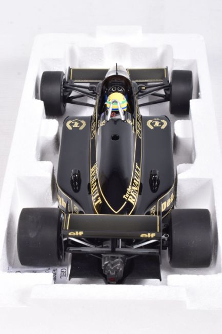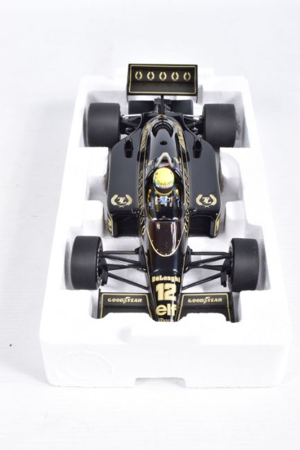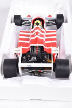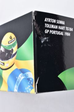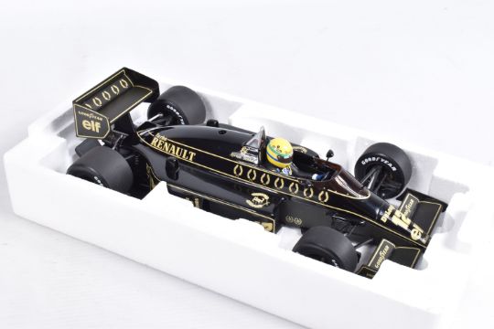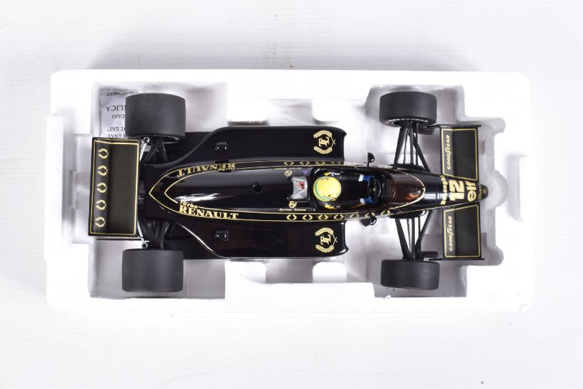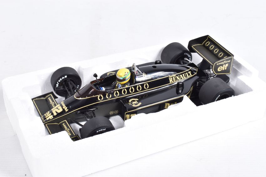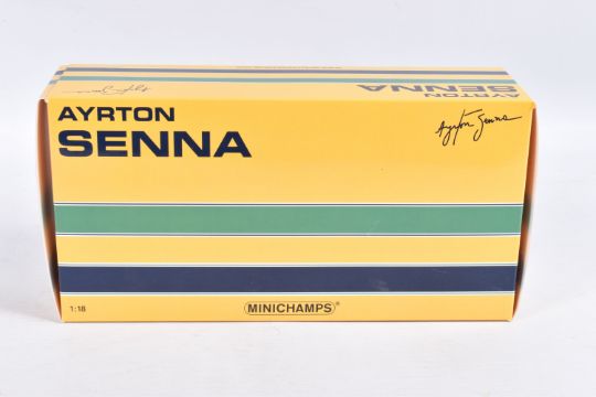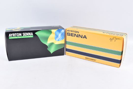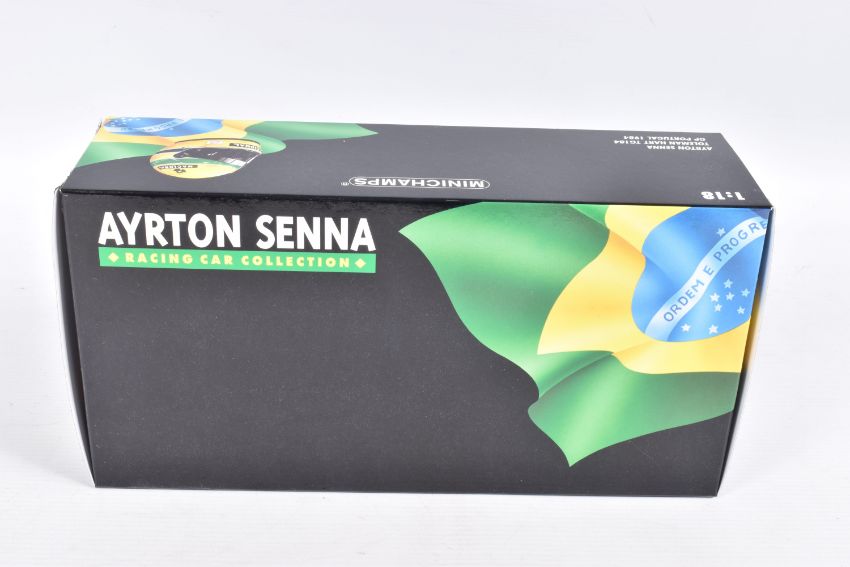 TWO BOXED MINICHAMPS AYRTON SENNA 1:18 SCALE DIECAST MODEL VEHICLES, the first a Toleman Hart TG184 GP Portugal 1984, numbered 540 841889, model is white and red striped signed Segafredo Zanetti Magirus to various panels, seated driver with yellow helmet, the second model is a Lotus Renault 98T Ayrton Senna 1986, numbered 540 861812, model is black with gold details, singed Turbo, Renault, De'Longhi and Elf sponsors, numbered 12 to front, both models appear in new condition inside their polystyrene packing and outer cardboard boxes