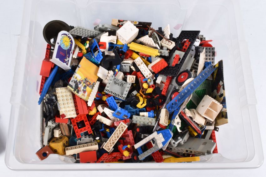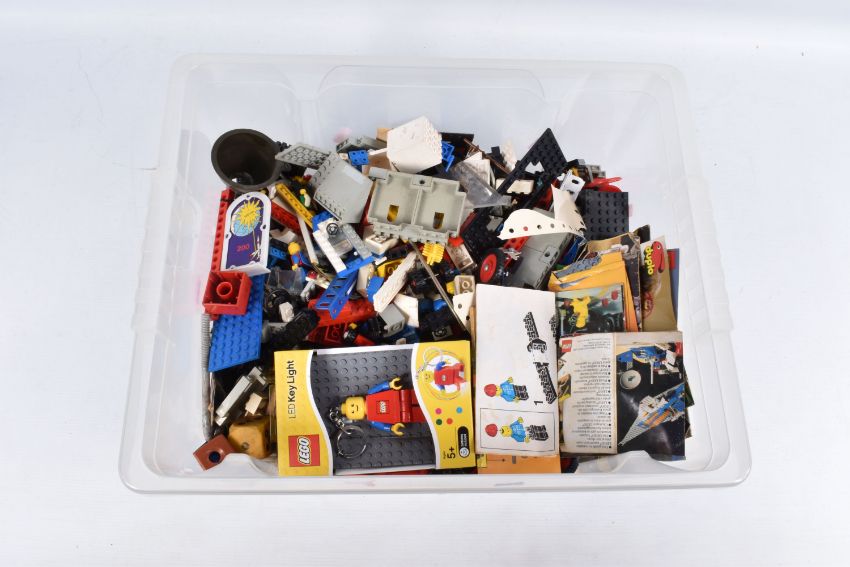 A QUANTITY OF ASSORTED LOOSE MODERN LEGO, to include boxed LED Key Light, assorted Mini-figures quantity of assorted plans and catalogues including Castle, Town and Space items, contents of any sets not checked, with a small quantity of modern Meccano