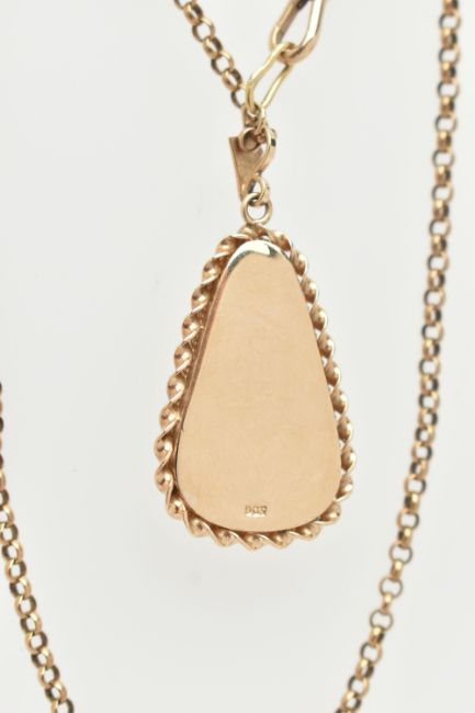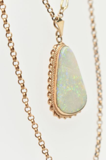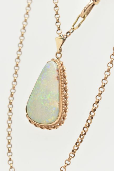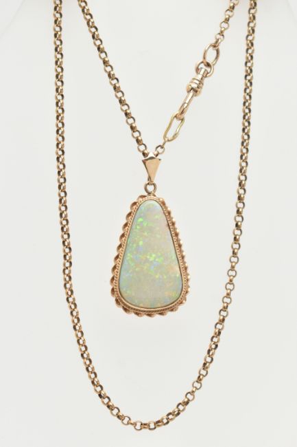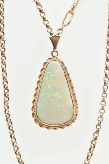 AN OPAL PENDANT AND CHAIN, the triangular opal within a collet and double rope twist surround, suspended from a belcher link chain, to the lobster claw clasp, reverse of pendant stamped 9ct, length of pendant 44mm, length of chain 570mm, approximate weight 15.9 grams (condition report: there are two hairline cracks near the top of the opal)