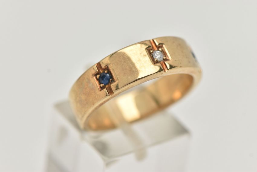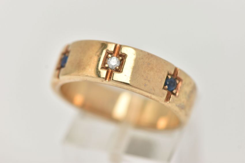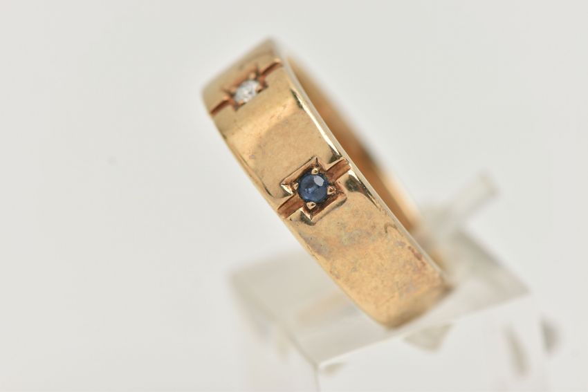 A GENTS 9CT GOLD SAPPHIRE AND DIAMOND RING, set with a central round brilliant cut diamond, flanked with two circular cut blue sapphires, on a polished band, hallmarked 9ct Birmingham, ring size leading edge S, approximate gross weight 7.9 grams (condition report: general light wear, stones secure, would benefit from a gentle clean and polish)