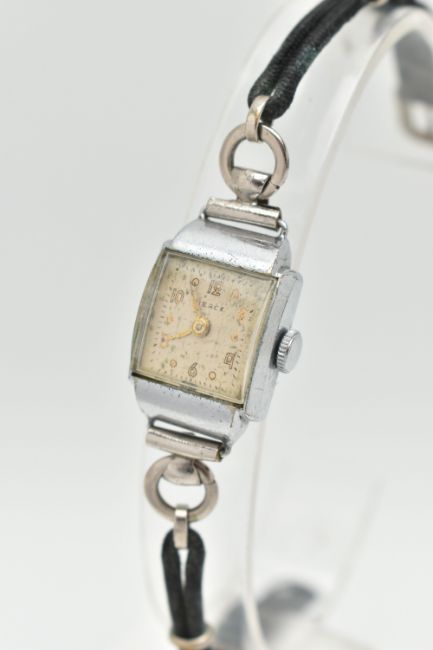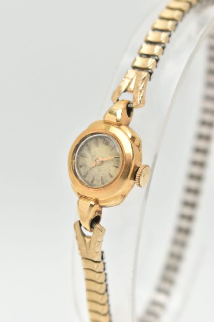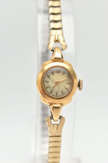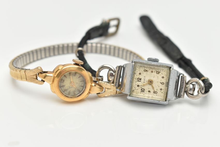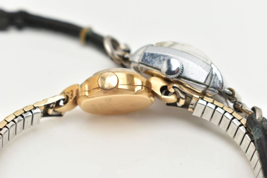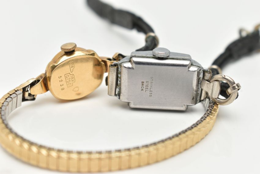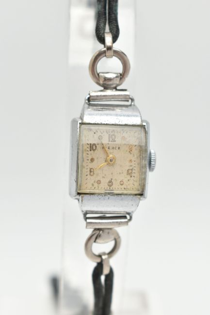 TWO LADIES WRISTWATCHES, the first a hand wound movement, round dial, baton markers, Arabic numeral at the twelve o'clock position, yellow gold case, approximate case width 15mm, case back stamped 750 18k Swiss control mark, approximate gross weight of case back 0.9 grams, fitted with a stretch link bracelet, together with a hand wound movement, square dial signed 'Peirce', fitted with a cordette strap, (condition report: general moderate wear, both watches wind and working at the time of cataloguing, time keeping not tested, overall condition good)