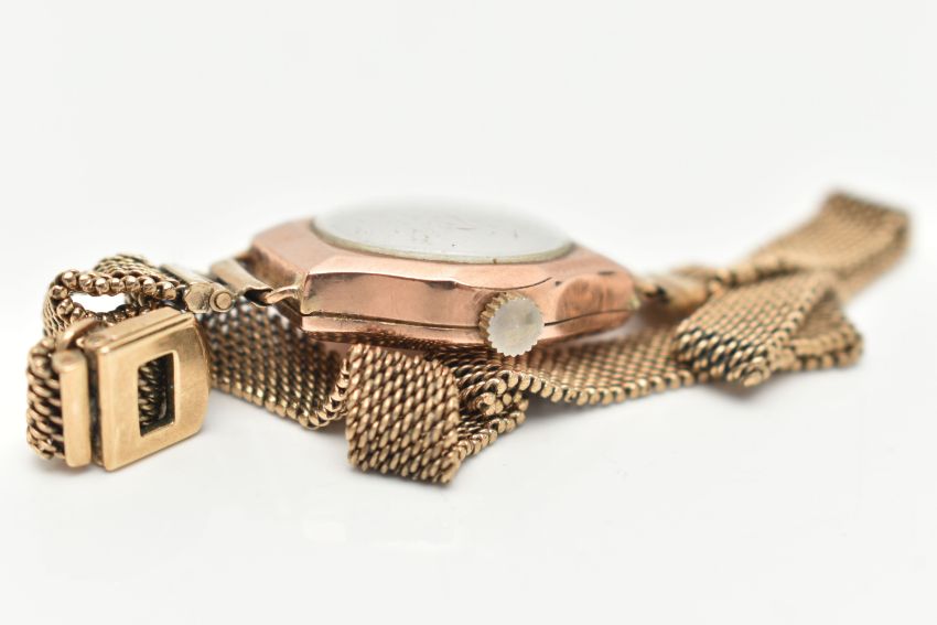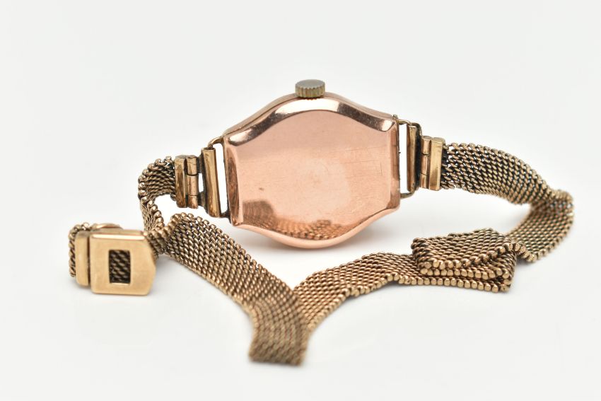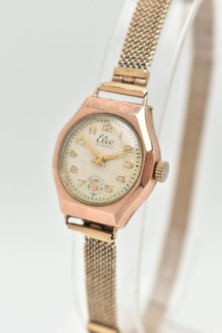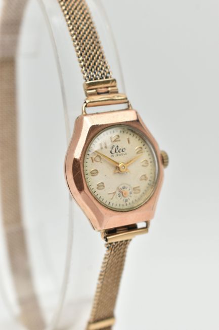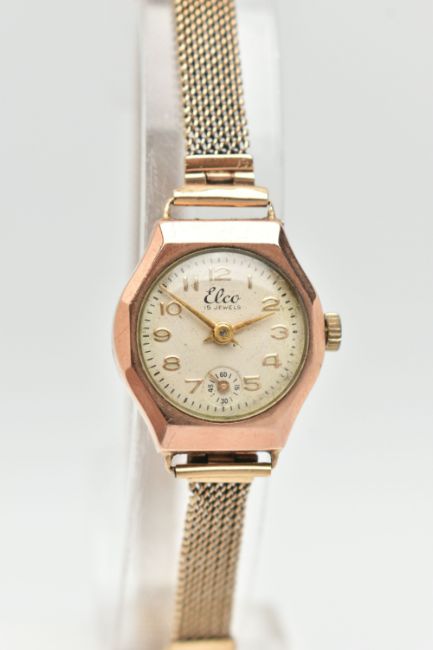 A 9CT GOLD WRISTWATCH, hand wound movement, round dial signed 'Elco' 15 jewels, Arabic numerals, subsidiary seconds dial at the six o'clock position, rose gold case, approximate case width 21mm, inside case back hallmarked 9ct Edinburgh, fitted with a mesh bracelet, approximate gross weight excluding movement 12.5 grams (condition report: general moderate wear, winds and working at the time of cataloguing, time keeping not tested, overall condition good)