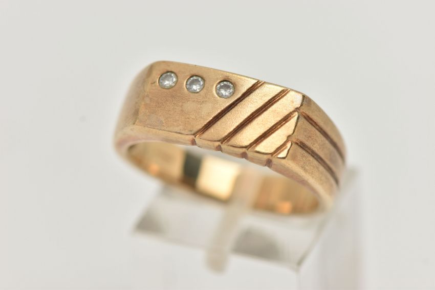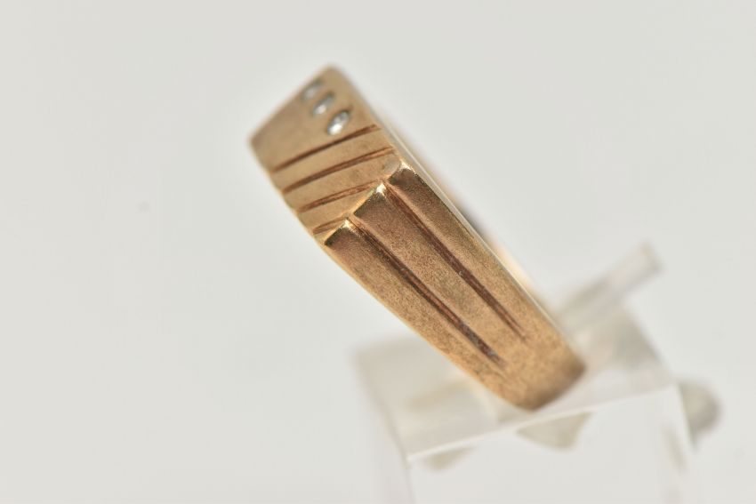 A GENTS 9CT GOLD DIAMOND SIGNET RING, rectangular signet set with three small, round brilliant cut diamonds and a textured pattern, hallmarked 9ct Birmingham, ring size S, approximate gross weight 7.0 grams (condition report: would benefit from a gentle clean and polish, stones secure, overall condition good)