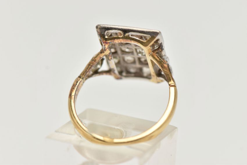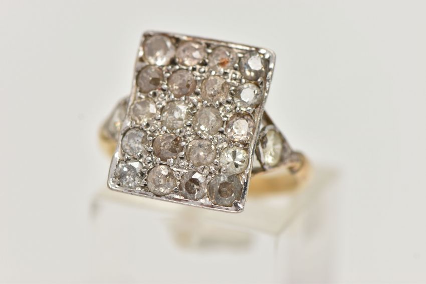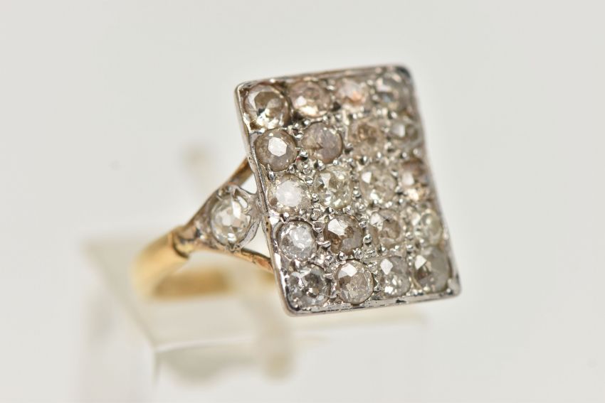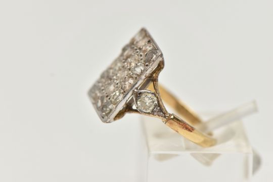 AN 18CT GOLD DIAMOND DRESS RING, designed as a rectangular panel set with twenty mainly old cut diamonds, to the bifurcated shoulders one set with a brilliant cut diamond, one with an old cut diamond, estimated total diamond weight 1.60cts, 18ct hallmark for Sheffield 2002, ring size M 1/2, approximate weight 4.6 grams (condition report: overall fair condition, diamonds are not well matched, amongst the old cuts there is a single cut and a brilliant cut, their heights vary, many show inclusions and/or internal fractures, all settings would benefit from being checked, would benefit from a clean)