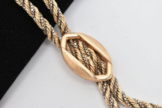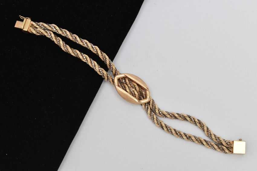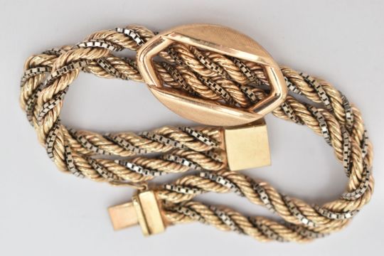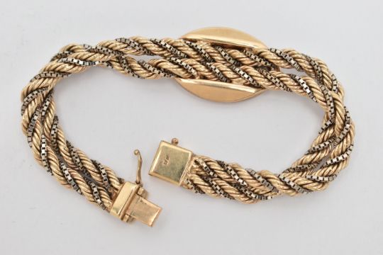A 9CT GOLD BRACELET, designed as a double rope twist and box link bi-colour bracelet with buckle detail to the centre, with push piece clasp and figure of eight safety clasp, import mark for London 1979, length 190mm, width 18mm, approximate weight 25.6 grams (condition report: overall good condition with light to moderate surface scratches from general wear)