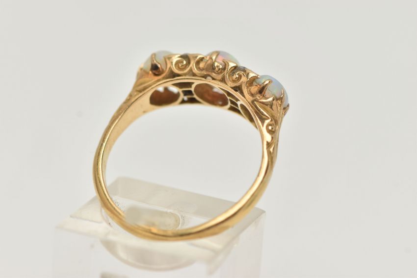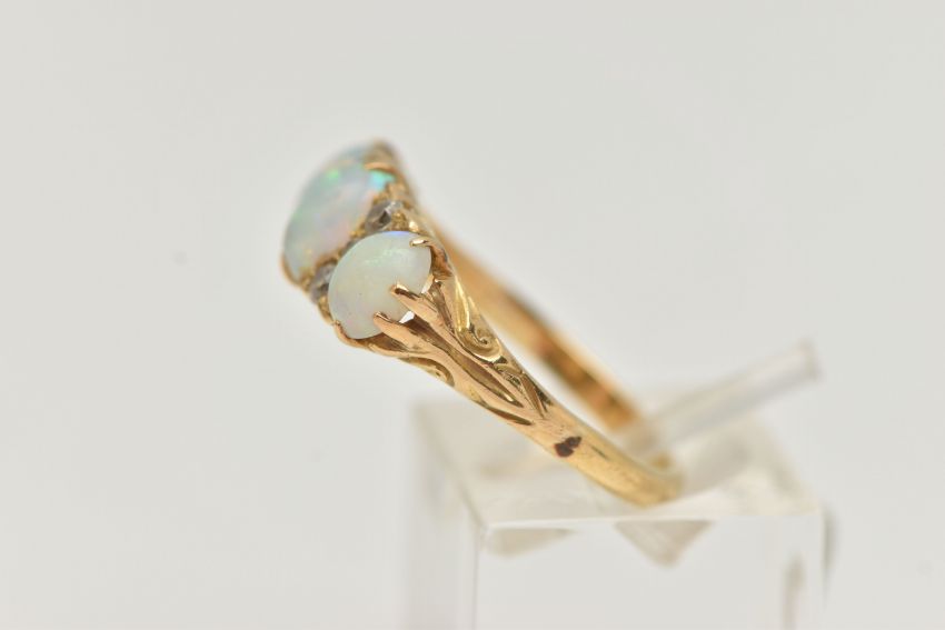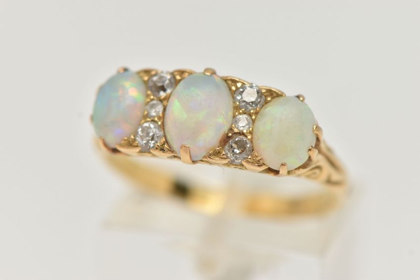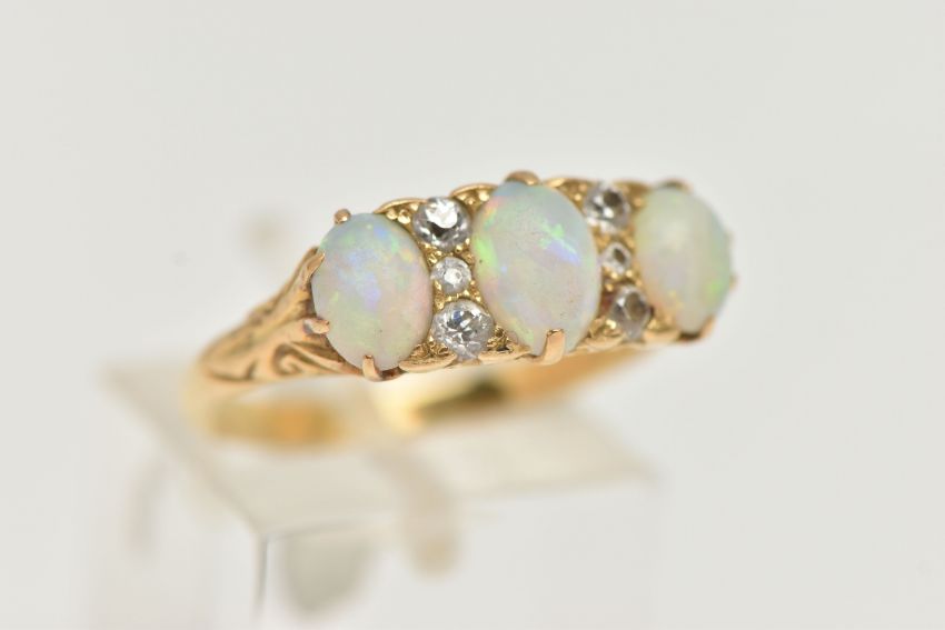 A LATE VICTORIAN OPAL AND DIAMOND RING, designed as three oval opal cabochons interspaced by a total of six old cut diamonds, estimated total diamond weight 0.20ct, approximate lengths of opals 6mm to 7mm, unmarked, ring size P 1/2, approximate weight 4.7 grams (condition report: overall good to fair condition, the opals have lost their surface lustre and show some minor wear, the diamonds are bright and lively, it would benefit from a gentle clean)