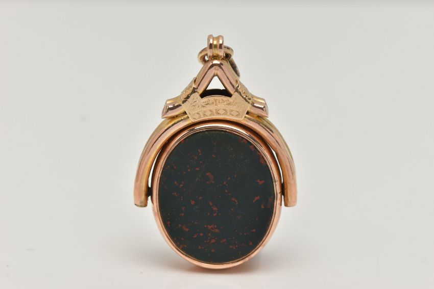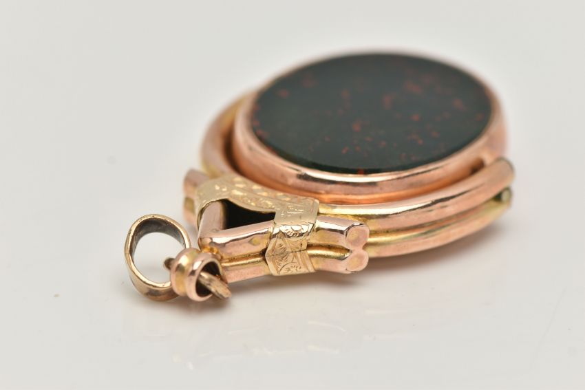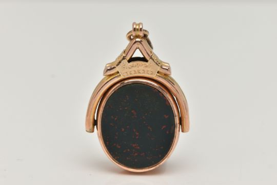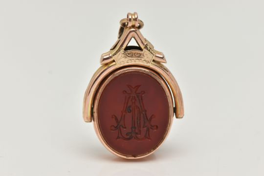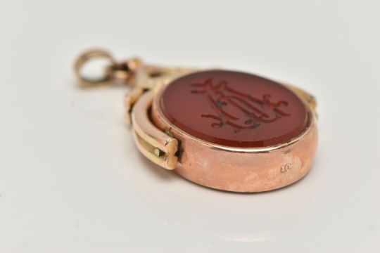 AN EARLY 20TH CENTURY SWIVEL FOB, the oval swivel fob set with a carnelian panel to one side engraved with a monogram, and a bloodstone panel to the other side, grip with engraved scrolling acanthus leaf detail, mark rubbed, possibly reads 10ct, length 53mm, approximate weight 16.9grams (condition report: overall good to fair condition, some minor dints and surface scratches from general wear in keeping with the age of the piece)