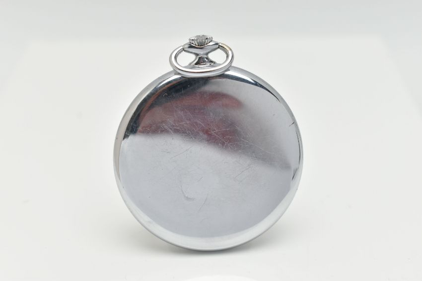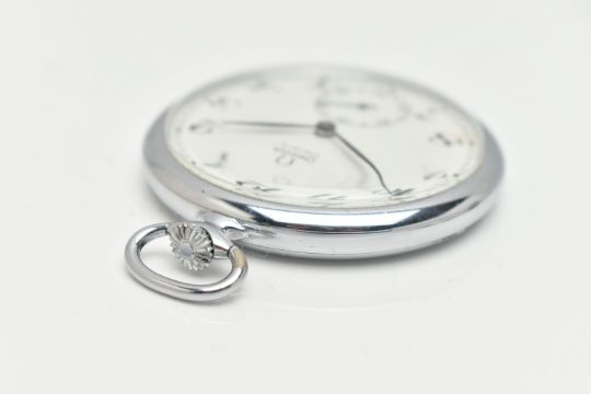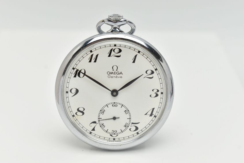 AN 'OMEGA' POCKET WATCH, hand wound movement, round white dial signed 'Omega' Geneve, Arabic numerals, subsidiary seconds dial at the six o'clock position, chrome case, approximate case width 48mm, inside case back signed 'Omega Watch Co' Fab Suisse, Swiss made 121 1740, movement signed 'Omega Swiss' 35156339, (condition report: general moderate wear, winds and working at the time of cataloguing, time keeping not tested, overall condition good)