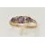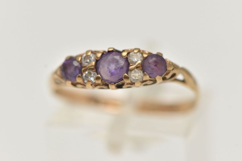 A 9CT GOLD AMETHYST AND CUBIC ZIRCONIA RING, set with three circular cut amethysts, flanked with four very small colourless cubic zirconia, scrolling gallery, leading onto a polished band, hallmarked 9ct Edinburgh, ring size N, approximate gross weight 1.5 grams (condition report: shank misshapen, stones have abrasion and wear)