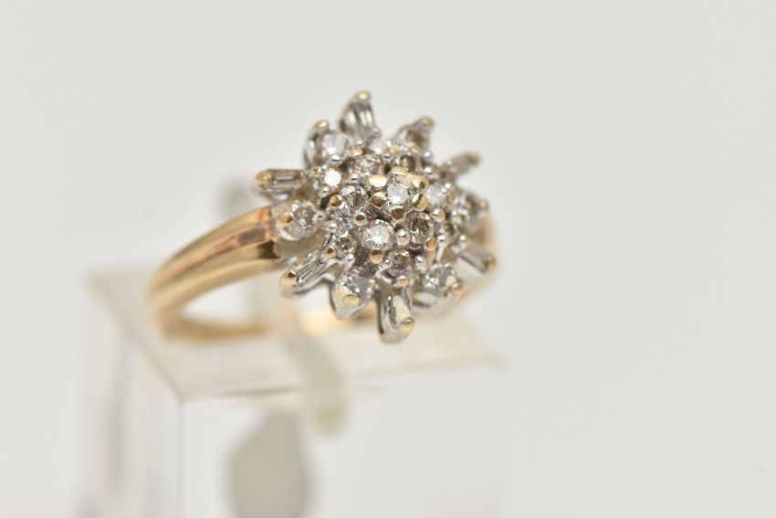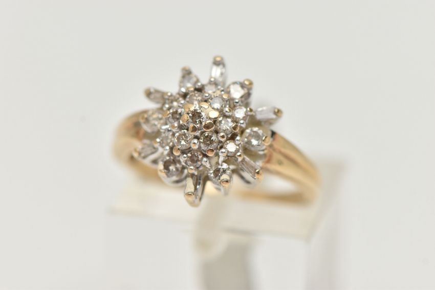 A 9CT GOLD DIAMOND CLUSTER RING, nineteen round brilliant cut diamonds and six baguette cut diamonds prong set in white gold, leading on to a yellow gold shank, hallmarked 9ct Birmingham, ring size J 1/4, approximate gross weight 3 grams (condition report: general moderate wear, would benefit from a gentle clean, all stones currently intact, overall condition good)