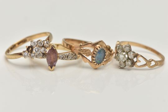 FOUR 9CT GOLD RINGS, to include a marquise cut amethyst and diamond ring, polished band, hallmarked 9ct Sheffield, stamped diamond weight .05ct, ring size L 1/2, a 9ct gold cubic zirconia flower cluster ring, open work heart detailed shoulders, polished band, hallmarked 9ct Birmingham, ring size K 1/2, an oval opal triplet cabochon ring, open work shoulders and polished band, hallmarked 9ct London, ring size N 1/2, and an AF cubic zirocina lozenge shape cluster ring (one stone is missing), polished band, hallmarked 9ct Edinburgh, ring size L 1/2, approximate gross weight 6.4 grams (condition report: one stone is missing from one ring and will require some attention, general light wear, all would benefit from a gentle clean and polish)