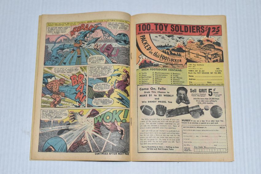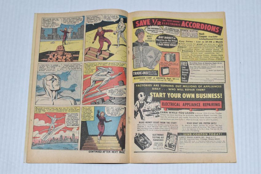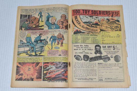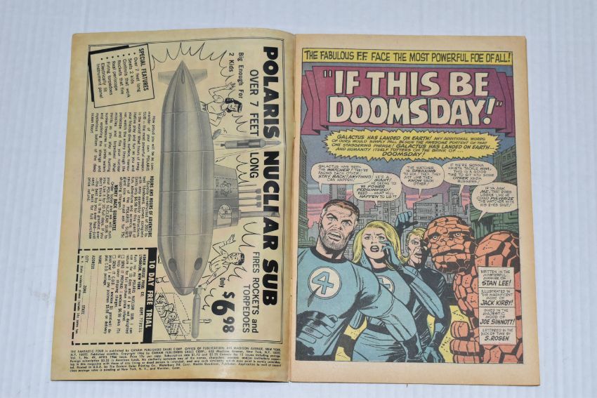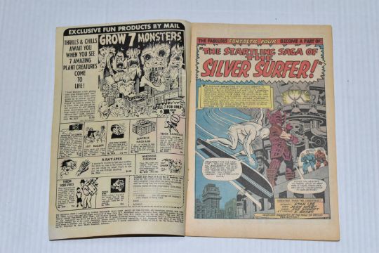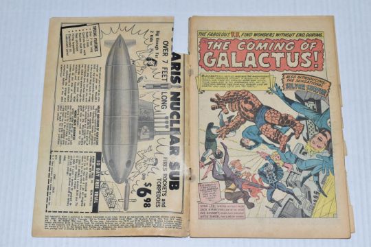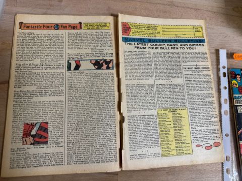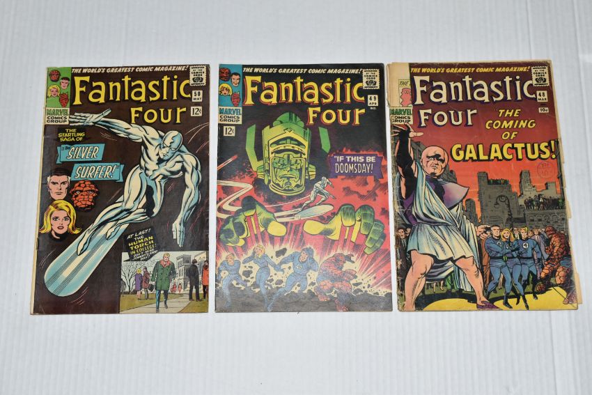 FANTASTIC FOUR NOS. 48, 49 & 50 MARVEL COMICS, first appearances of Silver Surfer and Galactus, number 48 has a piece of the front cover missing, has some small tears on the bottom of numerous pages, one page missing, half of the double fold the other half of the 'Fan Page' which is present but not attached, also has two bits been cut out - PLEASE SEE LAST TWO IMAGES (most don't reach the artwork) and the Marvel Bullpen Bulletins page is loose (all over pages and covers are securely attached), numbers 49 and 50 show signs of wear, but all their pages and covers are securely attached
