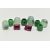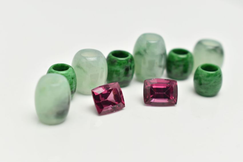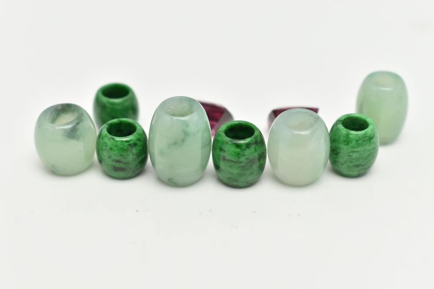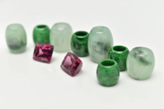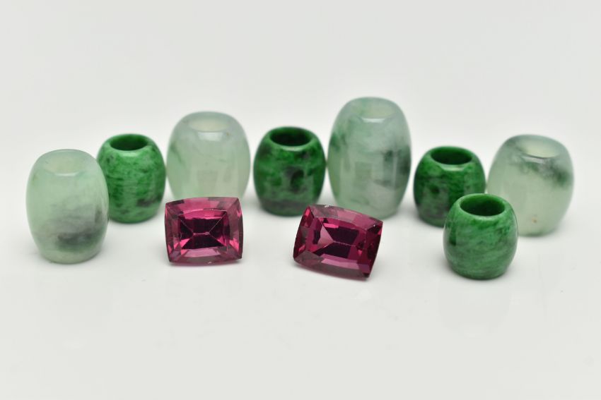 A SMALL BOX OF LOOSE GEMSTONES, to include four dyed jade barrel shape beads, measuring approximately largest length 12.0mm x width 9.2mm, smallest length 9.1mm x width 9.1mm, four green and black mottled hardstone barrel beads, largest measuring length 8.2mm x width 8.0mm, smallest length 7.3mm x width 7.8mm, together with two loose cushion cut Rhodolite garnets, measuring approximately length 8.5mm x 6.6mm x 5.4mm, and 7.8mm x 6.7mm x 5.4mm (condition report: light wear)