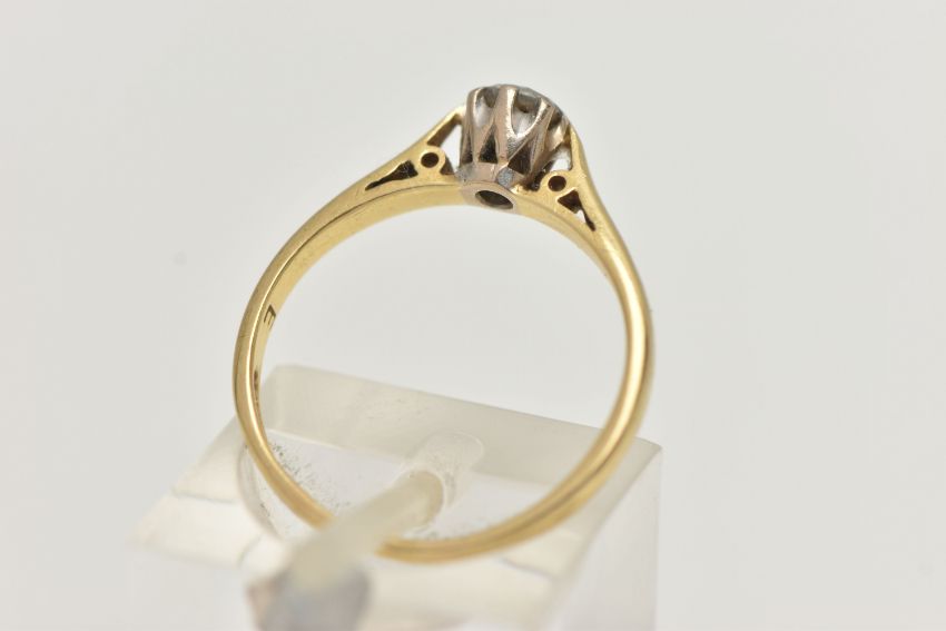 AN 18CT GOLD DIAMOND SINGLE STONE RING, a round brilliant cut diamond, approximate total diamond weight 0.25ct, approximate diameter 4.1mm, prong set in white gold, leading on to a pinched shoulder yellow gold shank, hallmarked 18ct Birmingham, ring size L, approximate gross weight 2.1 grams (condition report: general moderate wear, overall condition good)