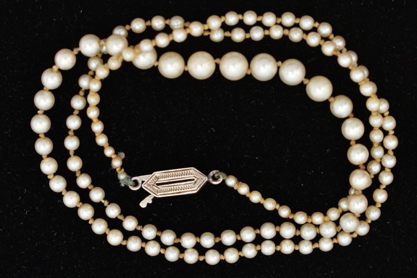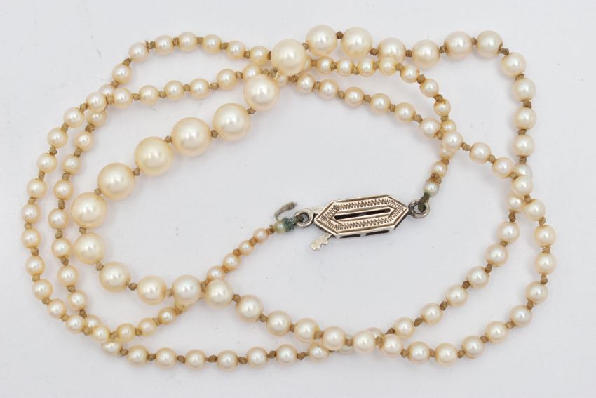A SINGLE STRAND CULTURED PEARL NECKLACE, graduated pearls ranging from approximate diameter 2.3mm to 6mm, fitted with a white metal pearl clasp, unmarked, approximate necklace length 555mm (condition report: general moderate wear, overall condition good)