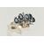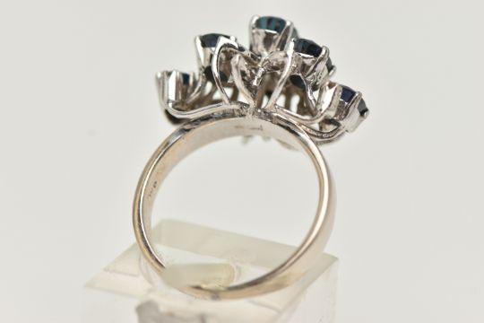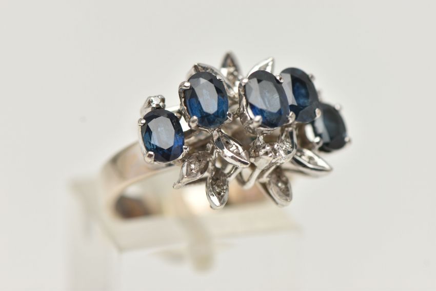A WHITE METAL SAPPHIRE AND DIAMOND DRESS RING, set with five oval cut blue sapphires, single cut diamond leaf shape accents, open work raised gallery, leading onto a polished band, stamped 18k, ring size L, approximate gross weight 5.7 grams (condition report: stones secure, general light wear, previous ring size alteration visible, visible acid mark to the inside of the shank)