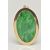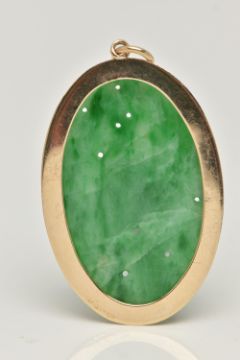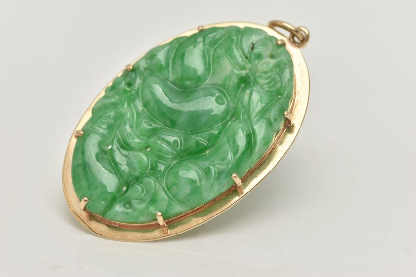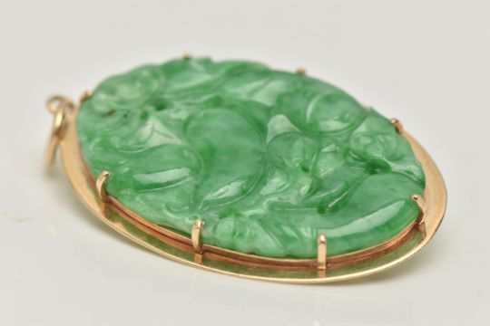 A 9CT GOLD CARVED JADE PENDANT, the oval jade panel carved to depict flowers, foliage and possibly fish, claw set in an oval mount, 9ct hallmark for London 1990, approximate length 48mm, approximate weight 8.2 grams (overall good condition, a few fine hairline cracks to the reverse)