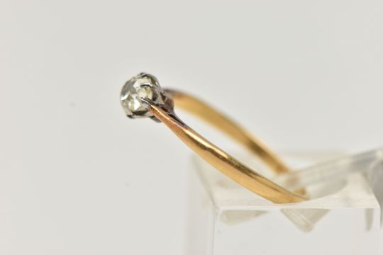 A YELLOW METAL SINGLE STONE DIAMOND RING, old cut diamond, measuring approximately 4.7mm x 4.6 x 3.1mm, estimated diamond weight 0.40ct, colour assessed as L, clarity assessed as SI1/SI2, eight claw setting (one claw requires attention), white metal mount leading onto a yellow metal band, stamped 18ct, ring size M, approximate gross weight 1.9 grams (condition report: diamond draws colour, one claw requires attention, general light wear, slight discoloration, would benefit from a gentle clean and polish)