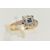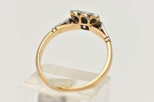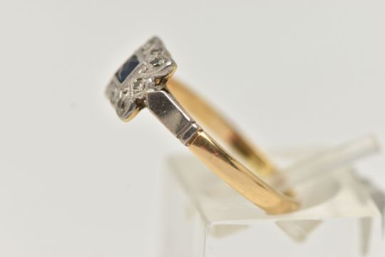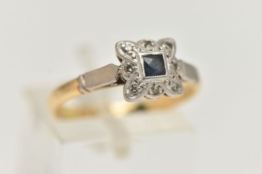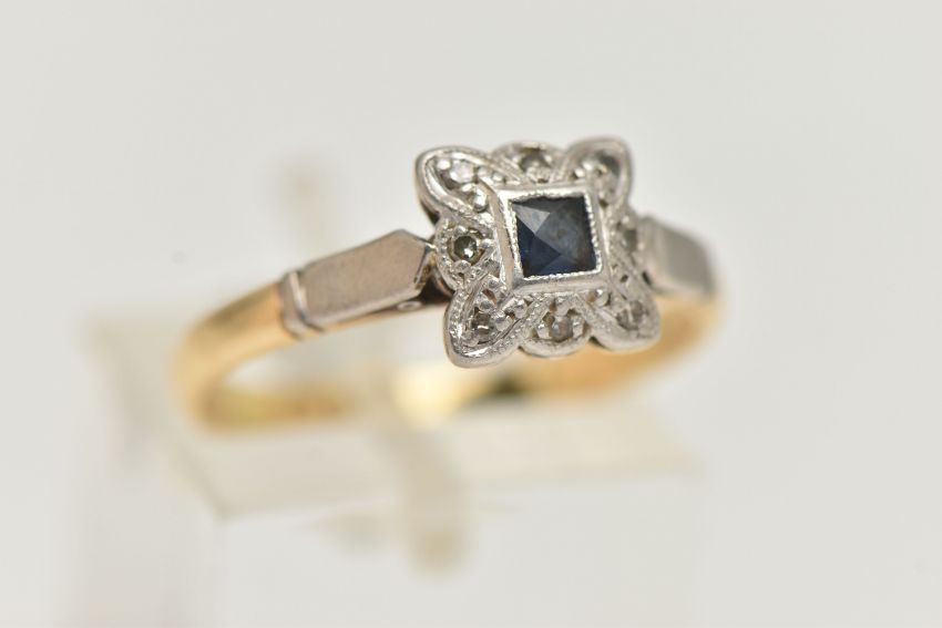 A YELLOW AND WHITE METAL SAPPHIRE AND DIAMOND RING, set centrally with a deep blue square cut sapphire, within a single cut diamond surround, in a white metal mount, textured shoulders leading onto a polished band, stamped ct&Plat, ring size N, approximate gross weight 3.3 grams (condition report: general light wear, would benefit from a gentle clean and polish)