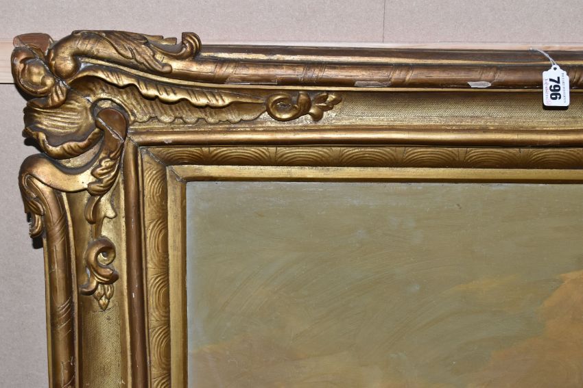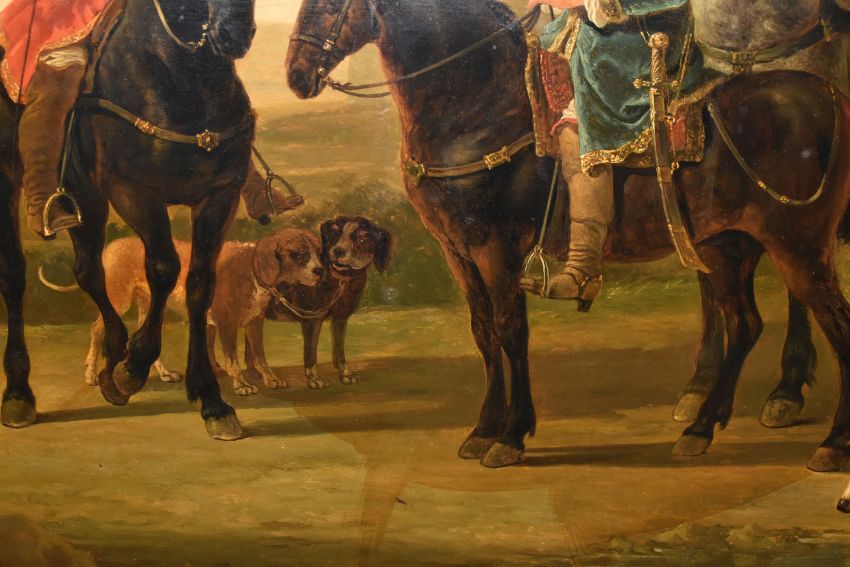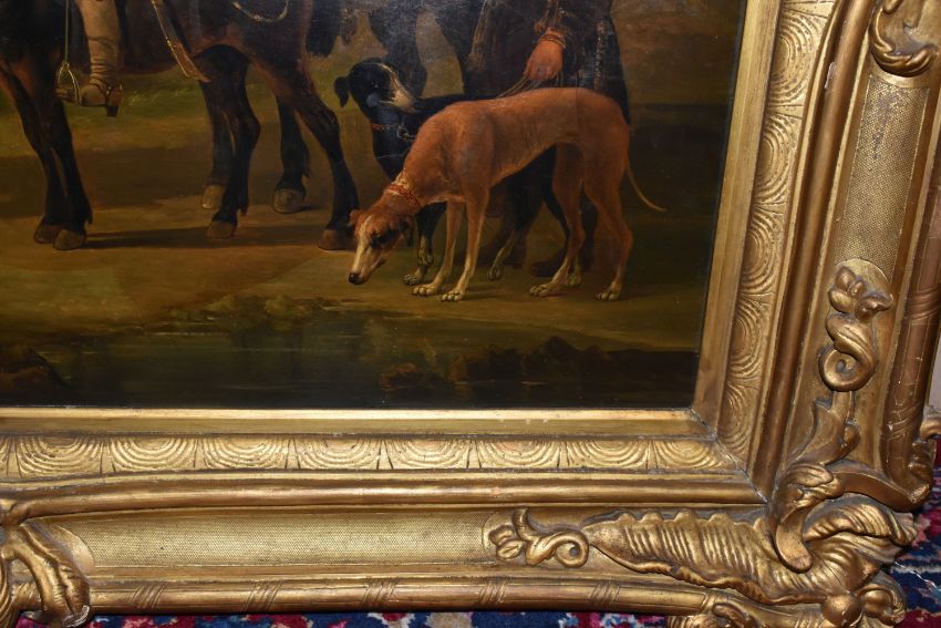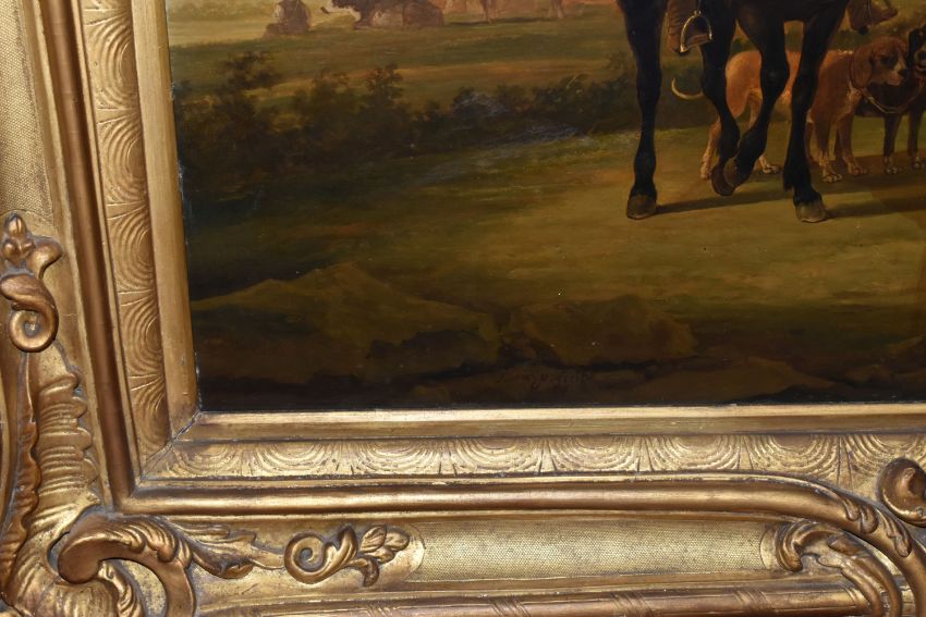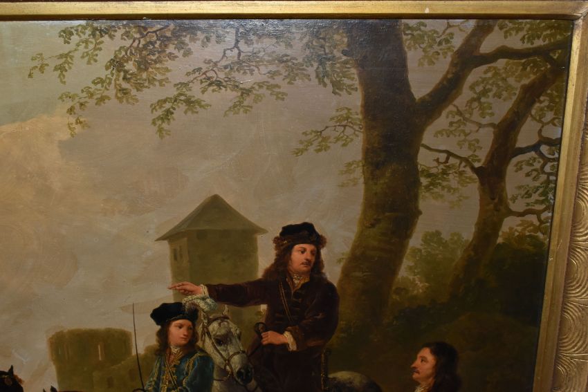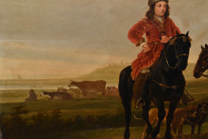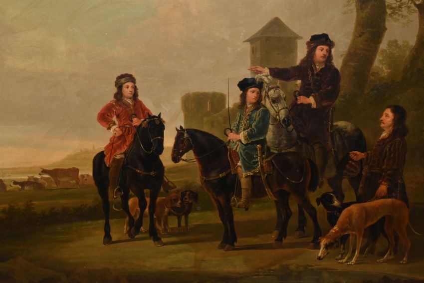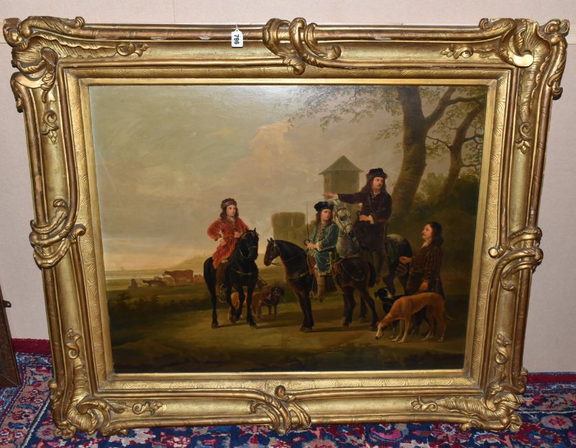 MANNER OF AELBERT CUYP 'LANDSCAPE WITH HUNTING PARTY', Dutch landscape with three men on horseback, oil on panel, possibly an overpainted print, signed lower left, bears hand written title and attribution verso, 73cm x 91cm, in a heavy gilt frame (Condition Report: would benefit from a professional clean, possibly an overpainted print)