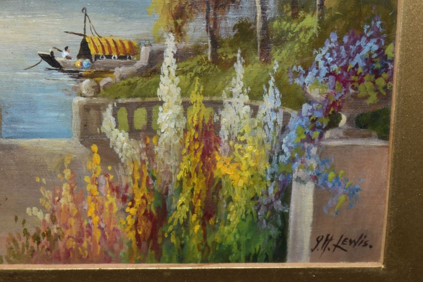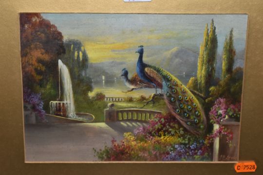 J.H. LEWIS (19TH/20TH CENTURY) A CONTINENTAL TERRACE WITH PEACOCKS, a Peacock and Peahen are perched upon branches of a tree above decorative plants, a fountain and boats on a lake lie beyond, signed bottom right, oil on canvas laid on board?, approximate size 18cm x 25cm, together with a companion painting by the same hand depicting birds in a tree with a path leading to a lake with boats, signed bottom right, approximate size 18cm x 25cm, Condition Report: the paintings are in good condition, some losses to the frames