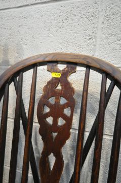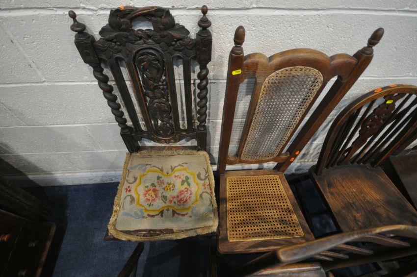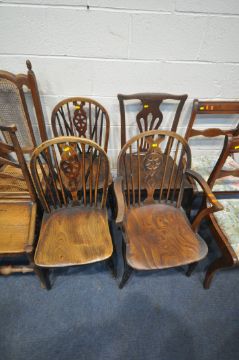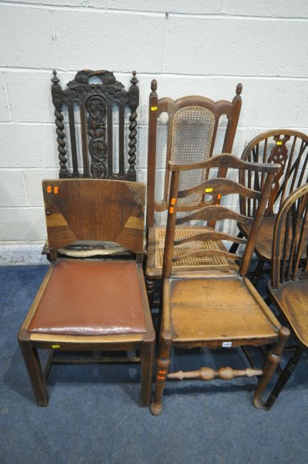 A SELECTION OF VARIOUS CHAIRS, of various ages and styles to include a carved oak high back chair, three wheel back chairs, elm ladder back chair, etc (condition report: all with some faults, scuffs and scratches, broken top rail to wheelback armchair, some woodworm to some chairs) (10)