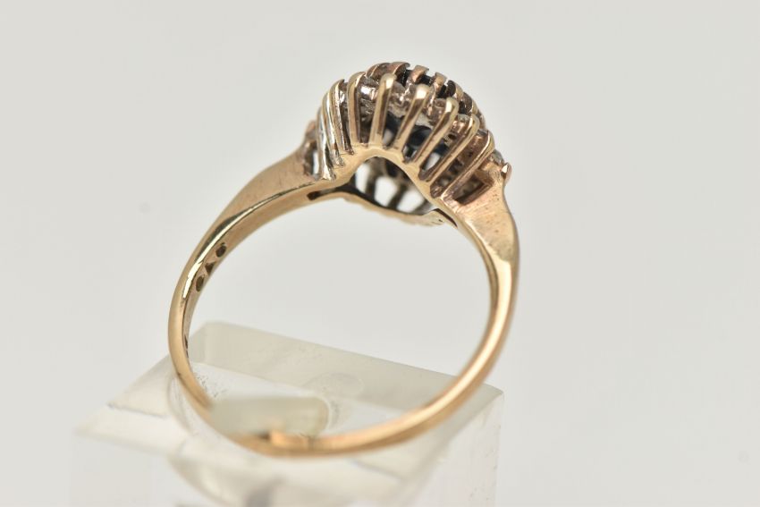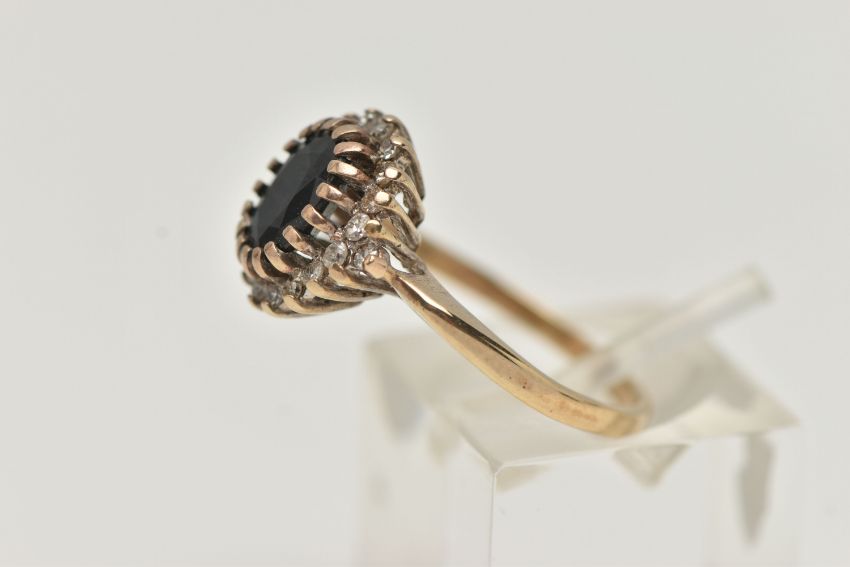 A 9CT GOLD SAPPHIRE AND DIAMOND CLUSTER RING, the central oval sapphire within a single cut diamond surround, 9ct hallmark for London 1992, ring size N, approximate weight 2.8 grams (condition report: the sapphire is very dark, the diamonds are heavily included, one outer diamond is chipped)
