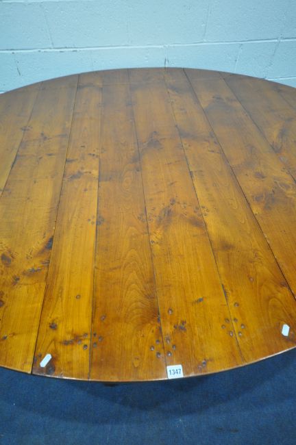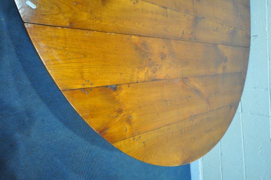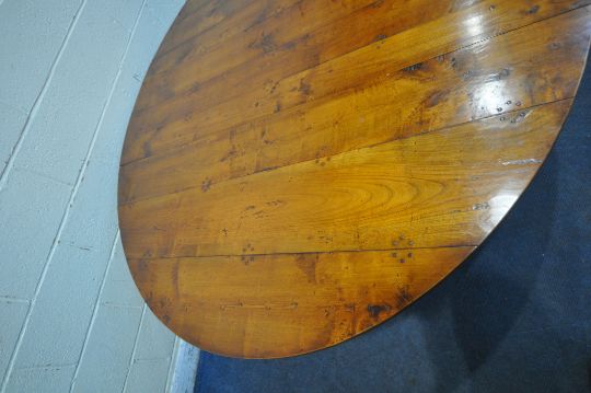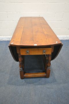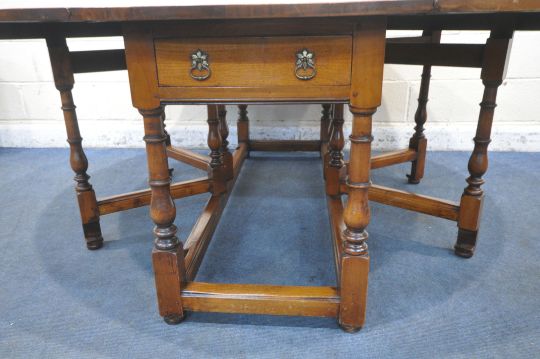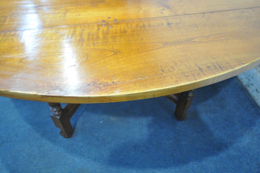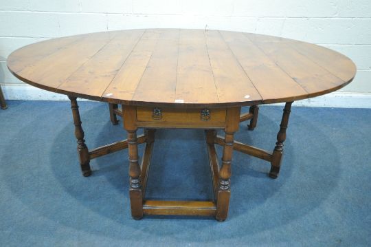 A GOOD QUALITY LARGE REPRODUCTION ELM DROP LEAF TABLE, with a single frieze drawer to each end, raised on block and turned legs, united by stretchers, open width 199cm x closed width 66cm x depth 168cm x height 74cm (condition report: general signs of wear and usage, some scuffs and discolouration to edges, other wear and usage)