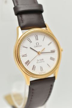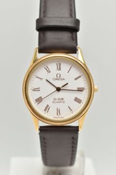 A GENTS 'OMEGA DE VILLE' WRISTWATCH, quartz movement, round white dial signed 'Omega De Ville, Quartz', Roman numerals, in a gold plated case with stainless steel case back, signed 'Omega De Ville' stamped 1336, approximate case width 32.5mm, fitted with a brown strap with white metal ardillon buckle (condition report: not working at time of cataloguing, case back has not been removed, general light wear, we cannot guarantee the working order of any watch)