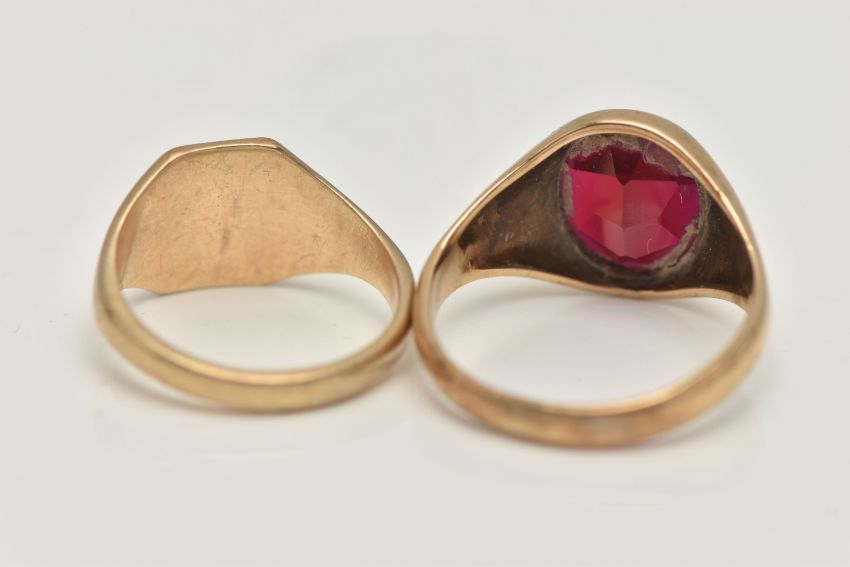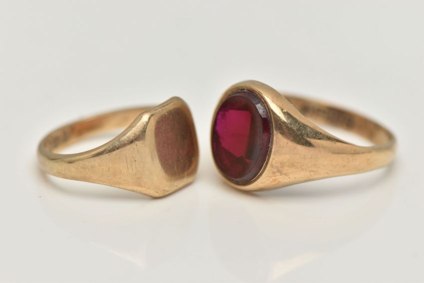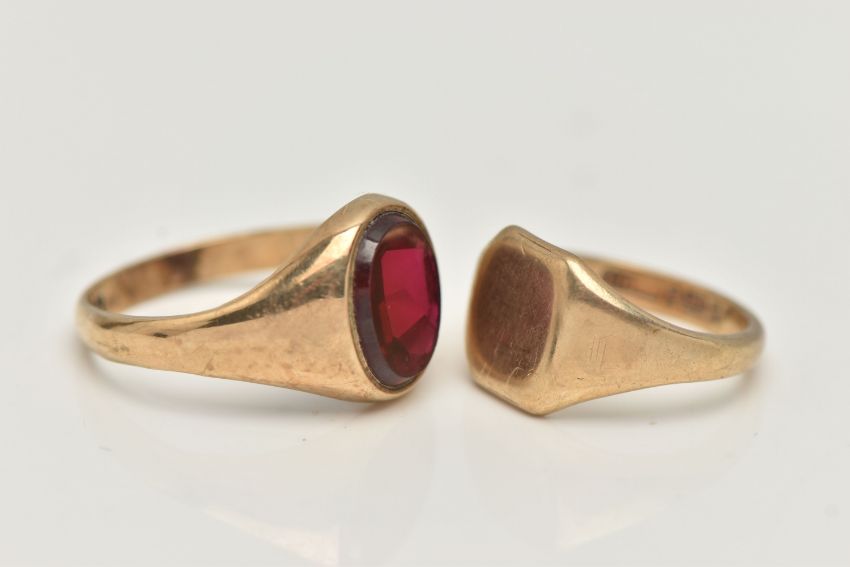 TWO 9CT GOLD SIGNET RINGS, the first a square form signet ring, hallmarked 9ct Birmingham, ring size G, together with an oval synthetic sapphire signet ring, hallmarked 9ct Birmingham, ring size L, approximate gross weight 6.1 grams (condition report: general moderate wear, overall condition good)