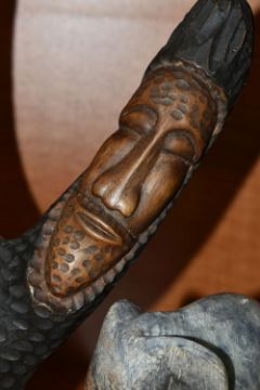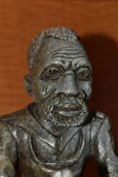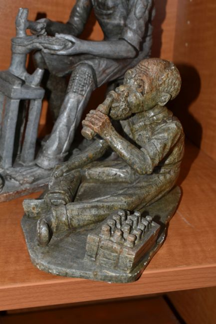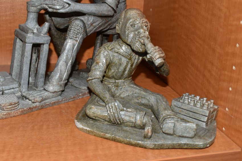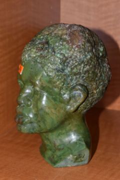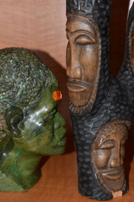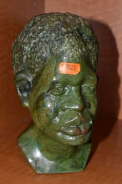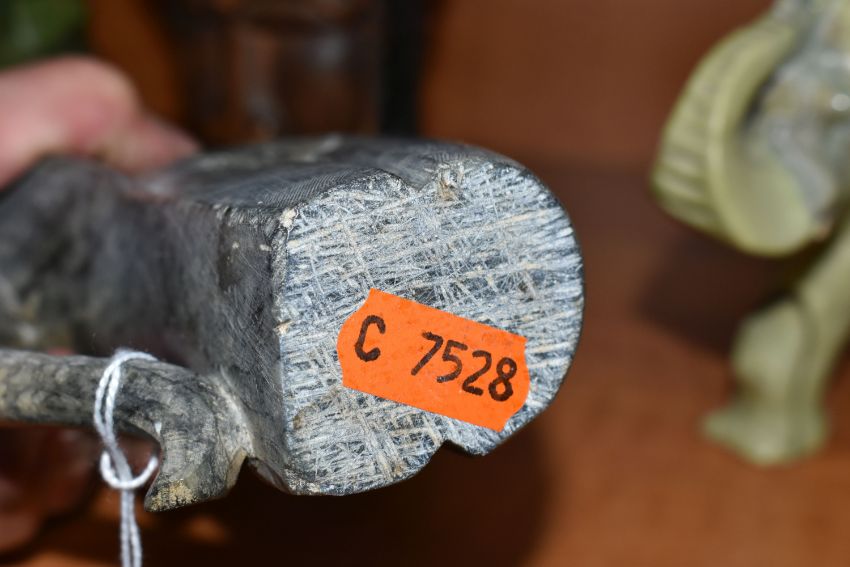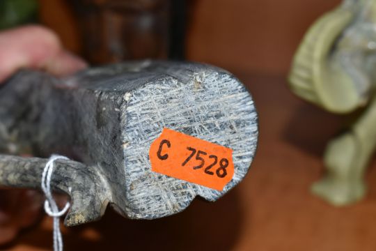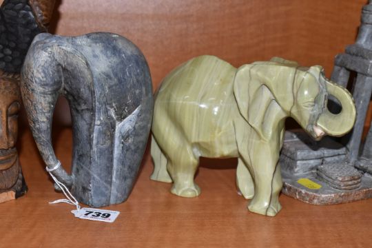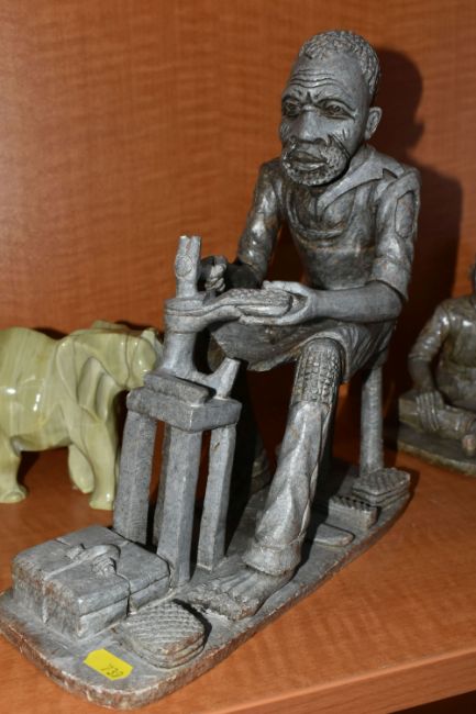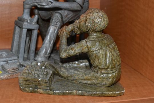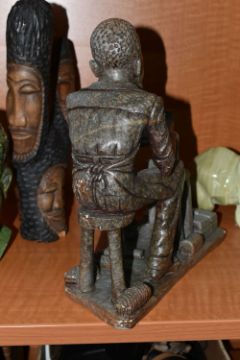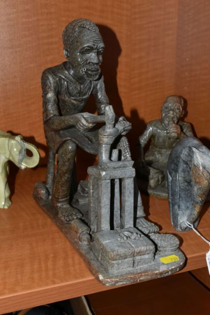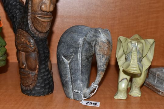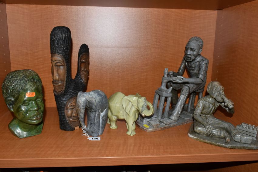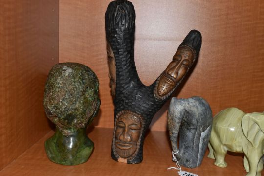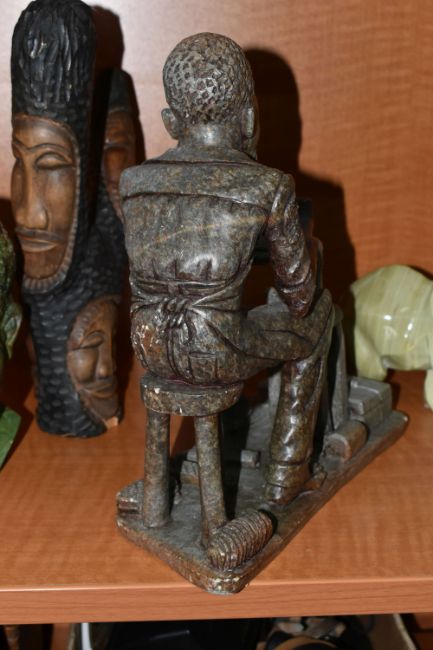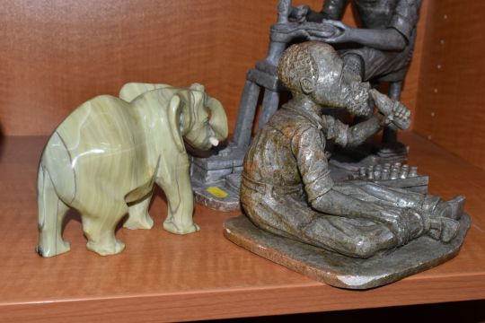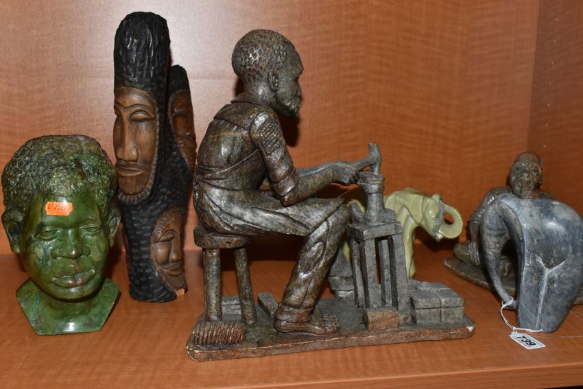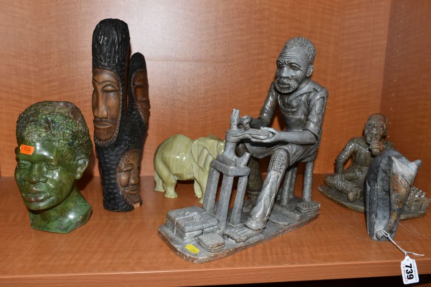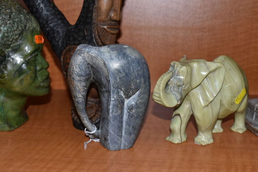 A COLLECTION OF SIX AFRICAN STONE AND TREEN FIGURAL CARVINGS, comprising two sculpted as men, one a cobbler, the other with a crate of drinks, a bust of a male carved from verdite, two elephants and a section of wood carved with three masks, height of tallest 33cm, s.d (6)