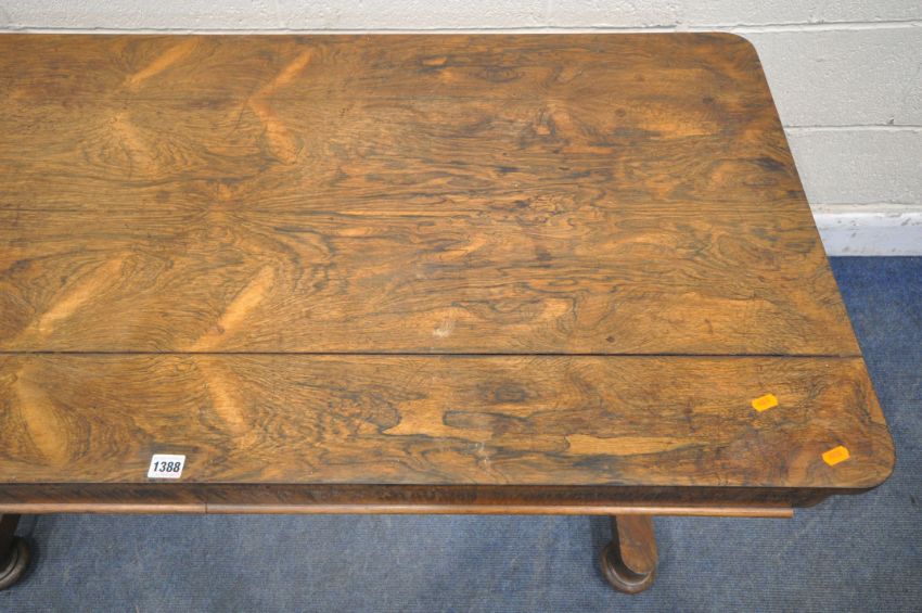 A WILLIAM IV ROSEWOOD LIBRARY TABLE, with two drawers, on twin cylindrical tapered legs, on flat bun feet covering brass casters, length 137cm x depth 66cm x height 73cm (condition report: historical split to the top surface, sun-bleached in areas, woodworm and unknown if treated, some veneer loss, beading missing to beading)
