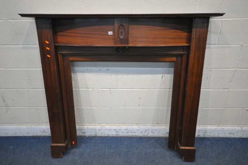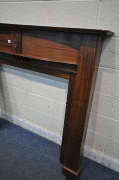A MAHOGANY FIRE SURROUND, width 153cm x height 139cm (condition report: pieces cut out to fit in a certain position)
