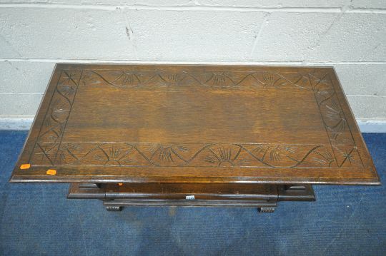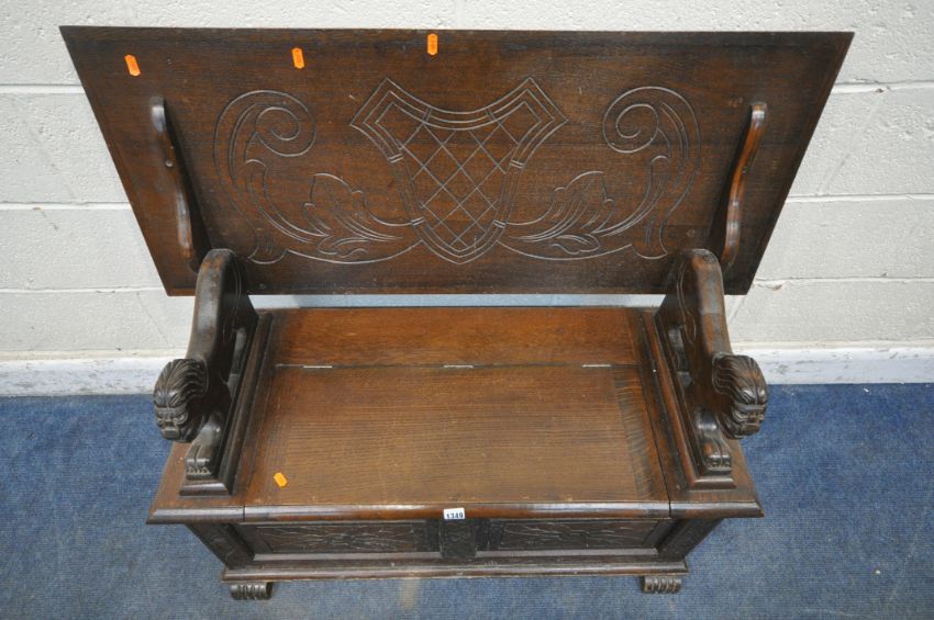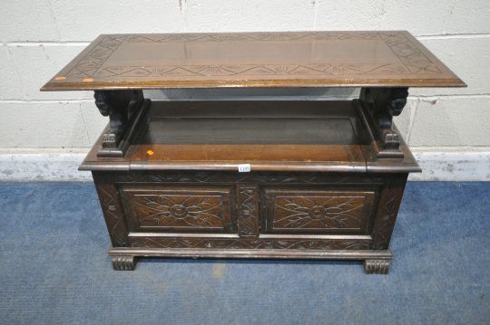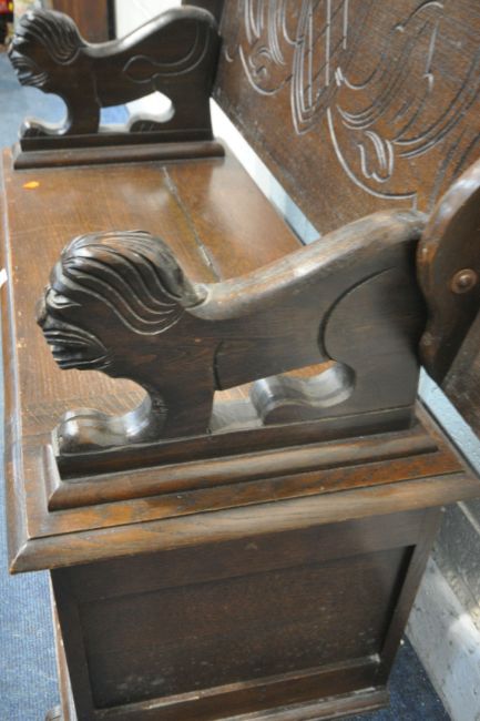 AN EARLY 20TH CENTURY OAK MONKS BENCH, with a rise and fall backrest / surface, lion armrests and a hinged storage seat, width 106cm x depth 46cm x height 68cm (condition report: surface marks, scuffs, discolouration, other wear and usage)