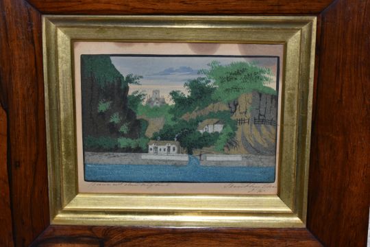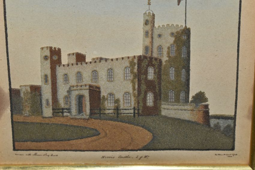 TWO MID 19TH CENTURY ISLE OF WIGHT MARMOTINTO SAND PICTURES, comprising a picture of Norris Castle by Edward Dore, the other depicts Shanklin Church above a bay (unsigned) , largest 8cm x 12.5cm, both have some discolouration to the paper (2)