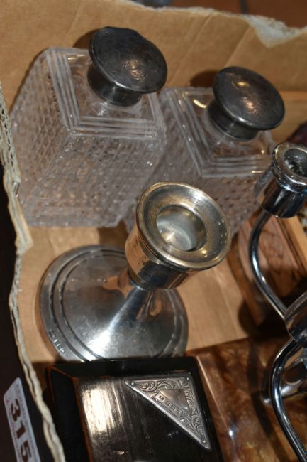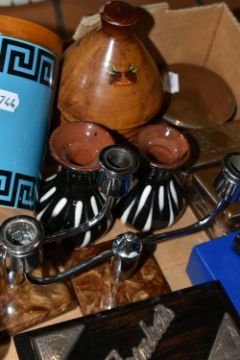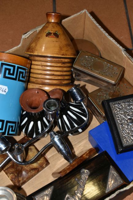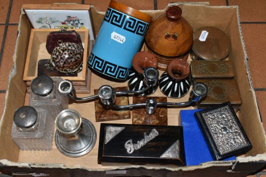 A BOX OF SILVER, CERAMICS AND MISCELLANEOUS ITEMS, to include a silver candlestick, hallmarked Birmingham 1963, scent bottles and dressing table items with plated covers (some plating worn away to the copper), a pair of small double candleholders, a novelty wooden moneybox in the form of a beehive, a Portmeirion Greek Key canister (with non-original lid), three small purses: one made from cowry shells, etc (1 box) (sd)