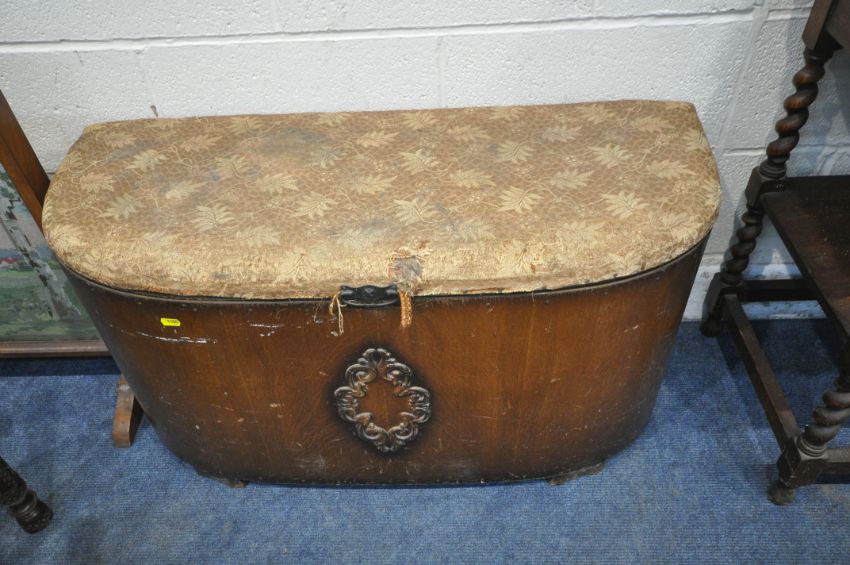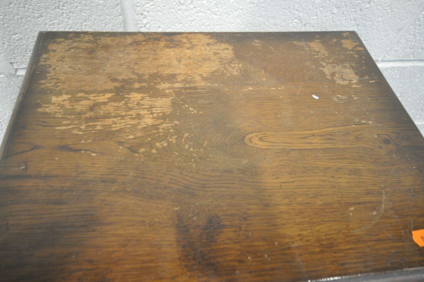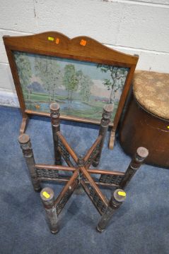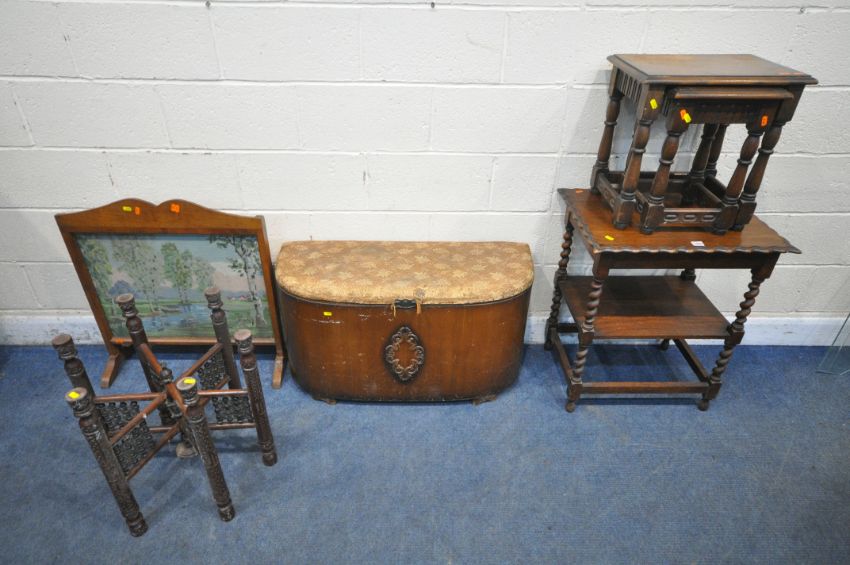 AN OAK BARLEY TWIST TWO TIER STAND, with a wavy top, width 61cm x 46cm x height 71cm, an oak nest of two tables, oak blanket chest, oak framed fire screen and a folding table base (condition report: nest of tables stained, scuffs and scratches to blanket chest) (5)