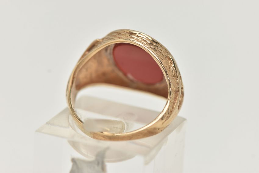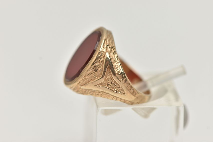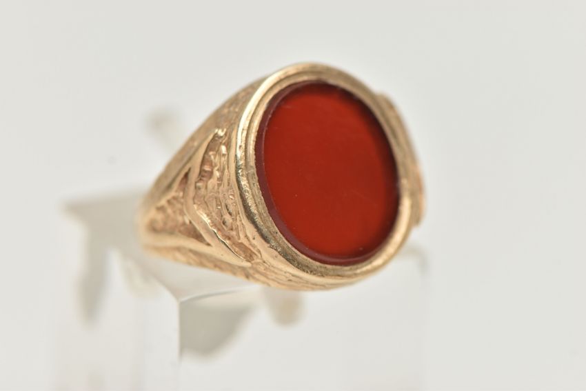 A 9CT GOLD SIGNET RING, designed as an oval carnelian panel within a tapered ring mount with textured detail, 9ct hallmark rubbed, ring shank is oval shape so ring size is inaccurate, measures on ring stick as D, approximate weight 3.6 grams (condition report: moderate general wear, a few minor nibbles to edge of carnelian)