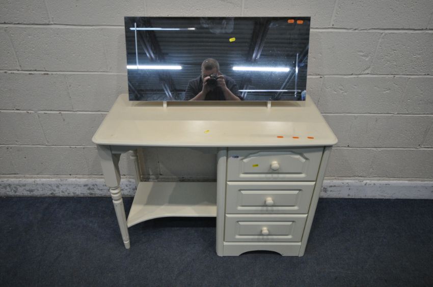 A CREAM DRESSING TABLE, fitted with three drawers, along with a rectangular dressing mirror, width 101cm x depth 49cm x height 76cm (condition report: general signs of wear and usage) (2)