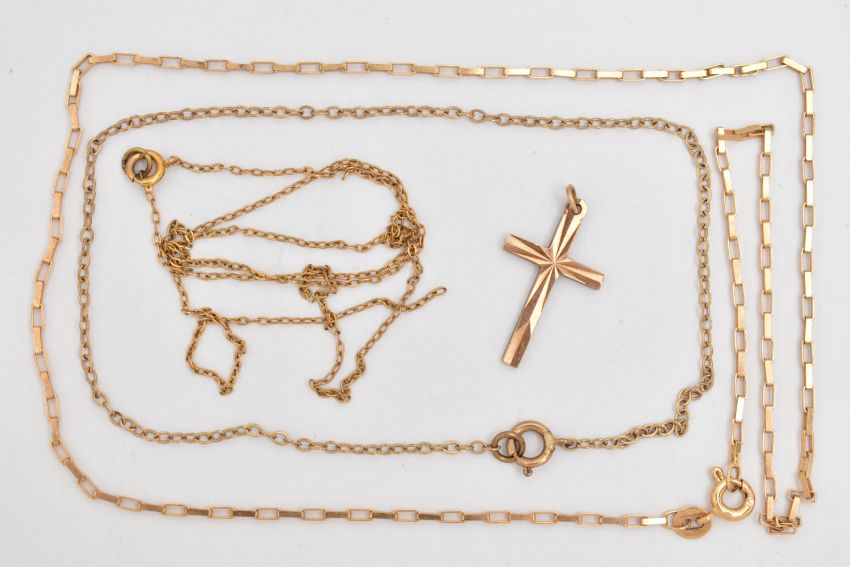 THREE CHAINS AND A CROSS PENDANT, the first a box link chain with spring clasp, hallmarked 9ct Birmingham import, length 400mm, a 9ct gold diamond cut pattern cross pendant fitted with a jump ring for suspension, hallmarked Birmingham, length including jump ring 25mm, approximate gross weight 3.5 grams, together with fine trace chain bracelet, fitted with a spring clasp, stamped 9ct, length 220mm, and a broken fine trace chain with spring clasp, stamped 9ct, approximate gross weight 1.8 grams (condition report: general light wear, one chain will require some attention)