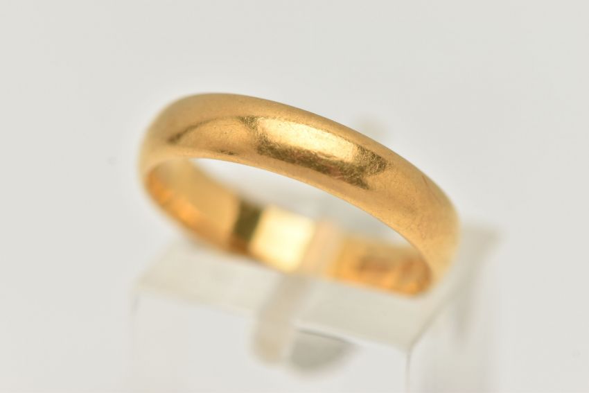 A 22CT GOLD BAND RING, a plain polished band ring, approximate width 4mm, hallmarked 22ct Birmingham 1924, ring size P leading edge, approximate gross weight 4.9 grams (condition report: general moderate wear, overall condition good)