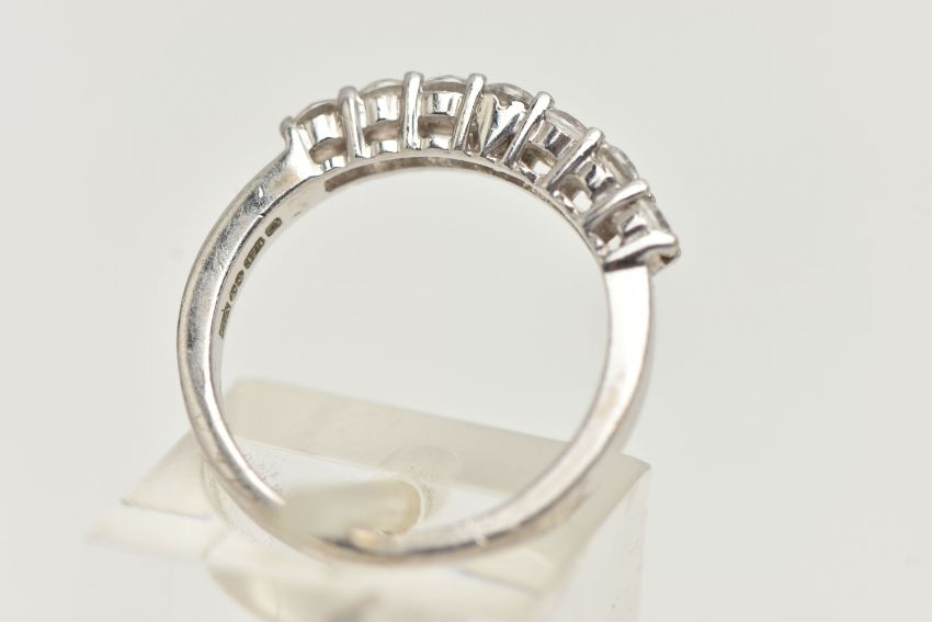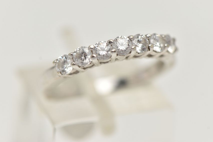 A 9CT WHITE GOLD CUBIC ZIRCONIA RING, designed as a line of seven circular cubic zirconia stones, to the plain band, 9ct hallmark for Sheffield, stamped CZ, approximate ring size K 1/2, approximate weight 2.7 grams (condition report: light to moderate general wear)