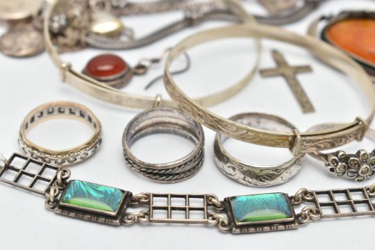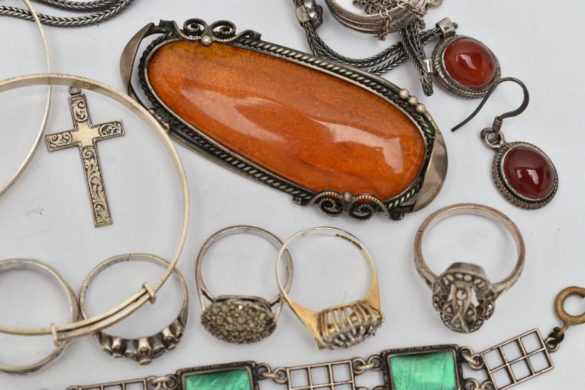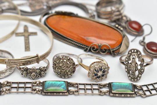 A COLLECTION OF SILVER, WHITE AND YELLOW METAL JEWELLERY, to include a yellow and white metal synthetic spinel eternity ring stamped 9ct & sil, ring size M, approximate gross weight 2.35 gram, a butterfly wing bracelet, length 176mm, stamped sterling silver England, clasp broken, an orange paste brooch within a scroll bead and rope twist border, three marcasite dress rings, together with further white metal and silver items, some items AF, approximate gross weight 99.41 grams (condition report: overall condition very good to fair, several items tarnished, general wear visible, clasp broken to butterfly brooch, synthetic spinels abraded to eternity ring)