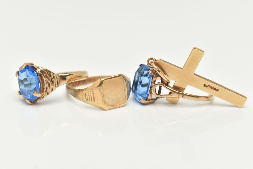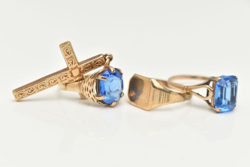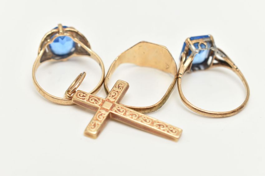THREE RINGS AND A CROSS PENDANT, to include an AF 9ct gold signet ring, misshapen band, hallmarked 9ct Birmingham, a 9ct gold ring set with an oval cut blue paste, hallmarked 9ct Birmingham, ring size K, a 9ct gold cross pendant, hallmarked 9ct Birmingham, fitted with a jump ring for suspension, length including jump ring 37mm, approximate gross weight 6.8 grams, together with a yellow metal ring set with a rectangular cut blue paste with cut off corners, ring stamped 9ct, ring size L, approximate gross weight 2.0 grams (condition report: general light wear, some misshapen shanks will require some attention)