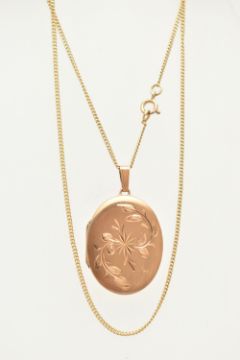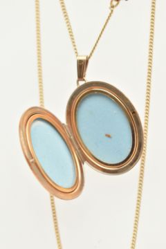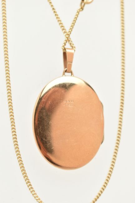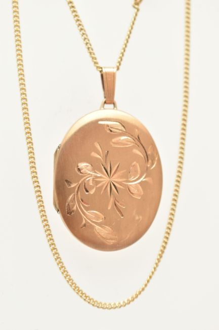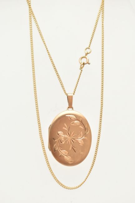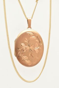 A 9CT GOLD OVAL LOCKET WITH CHAIN, floral pattern to one side of the oval locket, hallmarked 9ct Sheffield, fitted with a tapered bail, opens to reveal two photo compartments, length including bail 40mm, suspended from a fine curb link chain with spring clasp, hallmarked 9ct Birmingham, length 500mm, approximate gross weight 9.6 grams (condition report: general light wear, locket opens and closes with ease, clasp to the chain in working order)