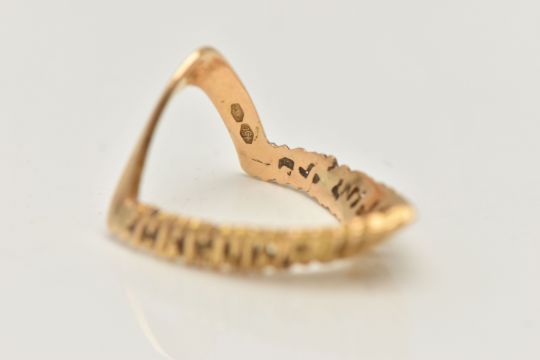 A YELLOW METAL TEXTURED WISH BONE RING, textured V shape, and polished reverse, stamped 750, ring size centre O 1/2, approximate gross weight 4.8 grams (condition report: general light wear)