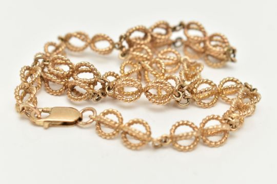 A 9CT GOLD FANCY LINK CHAIN, rope twist open work links, fitted with a lobster clasp, part Sheffield hallmark, clasp stamped 375, length 410mm, approximate gross weight 23.9 grams (condition report: general light wear, clasp in working order)