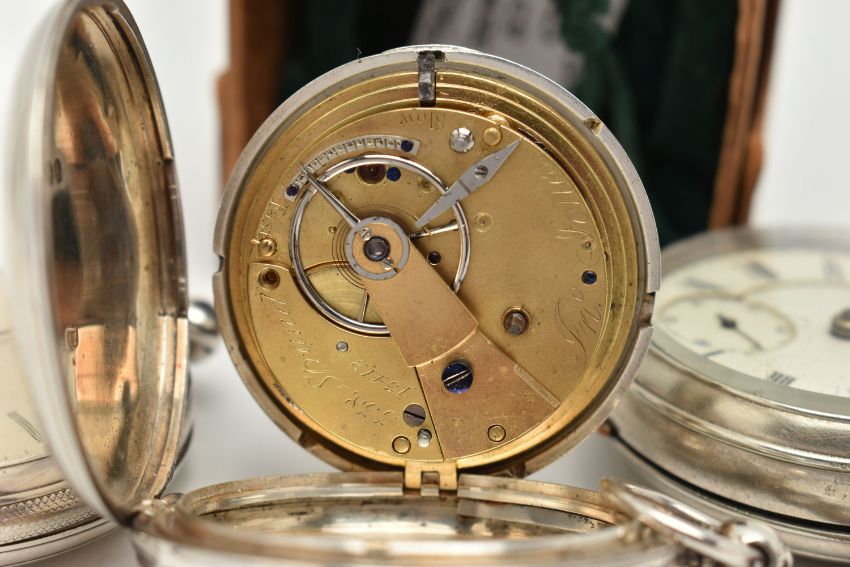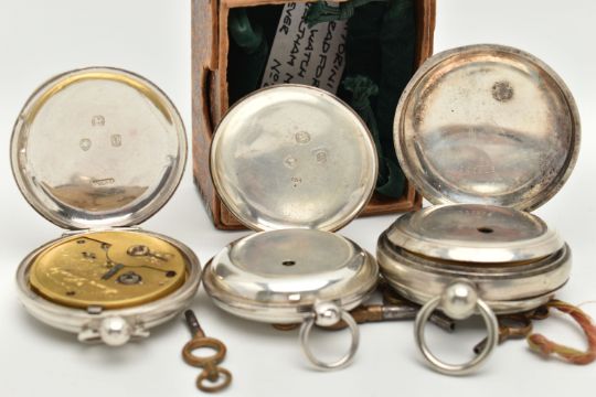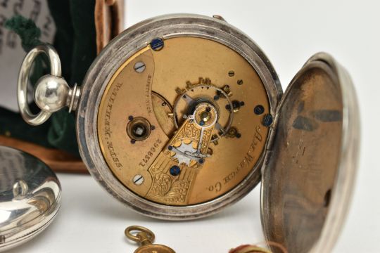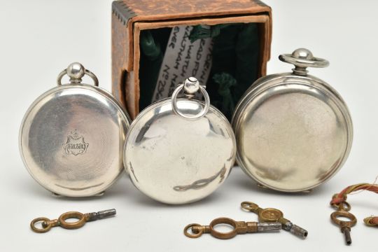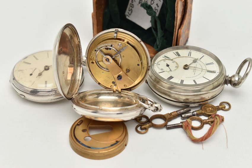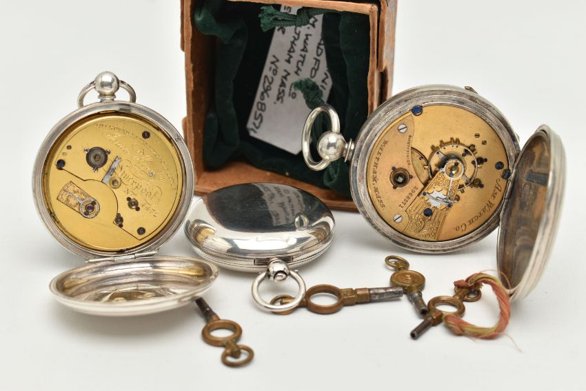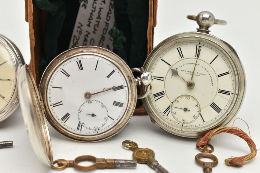THREE POCKET WATCHES, the first a silver full hunter pocket watch, Roman numerals, subsidiary second dial at the six o'clock position, plain polished case, approximate case width 46mm, hallmarked 'Alford Thickbroom' London 1861, movement signed 'Jones 338 Strand', approximate gross weight 86.4 grams, an open face pocket watch, key wound movement, an open face pocket watch, key wound movement, signed Fattorini & Sons watch & chronometer manufacturers, Roman numerals, subsidiary second dial at the six o'clock position, polished case, approximate case width 52mm, movement signed 'Waltham', a silver open face pocket watch, key wound movement, Roman numerals, subsidiary second dial at the six o'clock position, engine turned pattern case, approximate case width 48mm, hallmarked 'James Neale & Samuel Freeman' London 1856, movement signed 'James Hornby Liverpool', approximate gross weight 78.4 grams, (condition report: general moderate wear, watches have not been tested, we cannot guarantee the working condition of the watches)